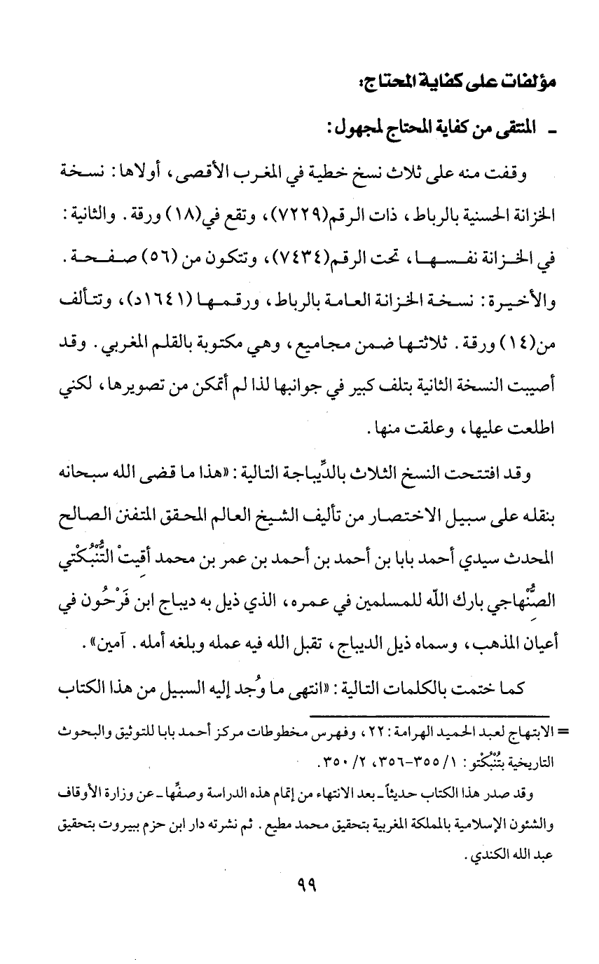 = الابتهاج لعبد الحميد الهرامة: 22، وفهرس مخطوطات مركز أحمد بابا للتوثيق والبحوث التاريخية بتنبكتو: 1/ 355 - 356، 2/ 350. وقد صدر هذا الكتاب حديثا - بعد الانتهاء من إتمام هذه الدراسة وصفّها - عن وزارة الأوقاف والشئون الإسلامية بالمملكة المغربية بتحقيق محمد مطيع. ثم نشرته دار ابن حزم ببيروت بتحقيق عبد الله الكندي.