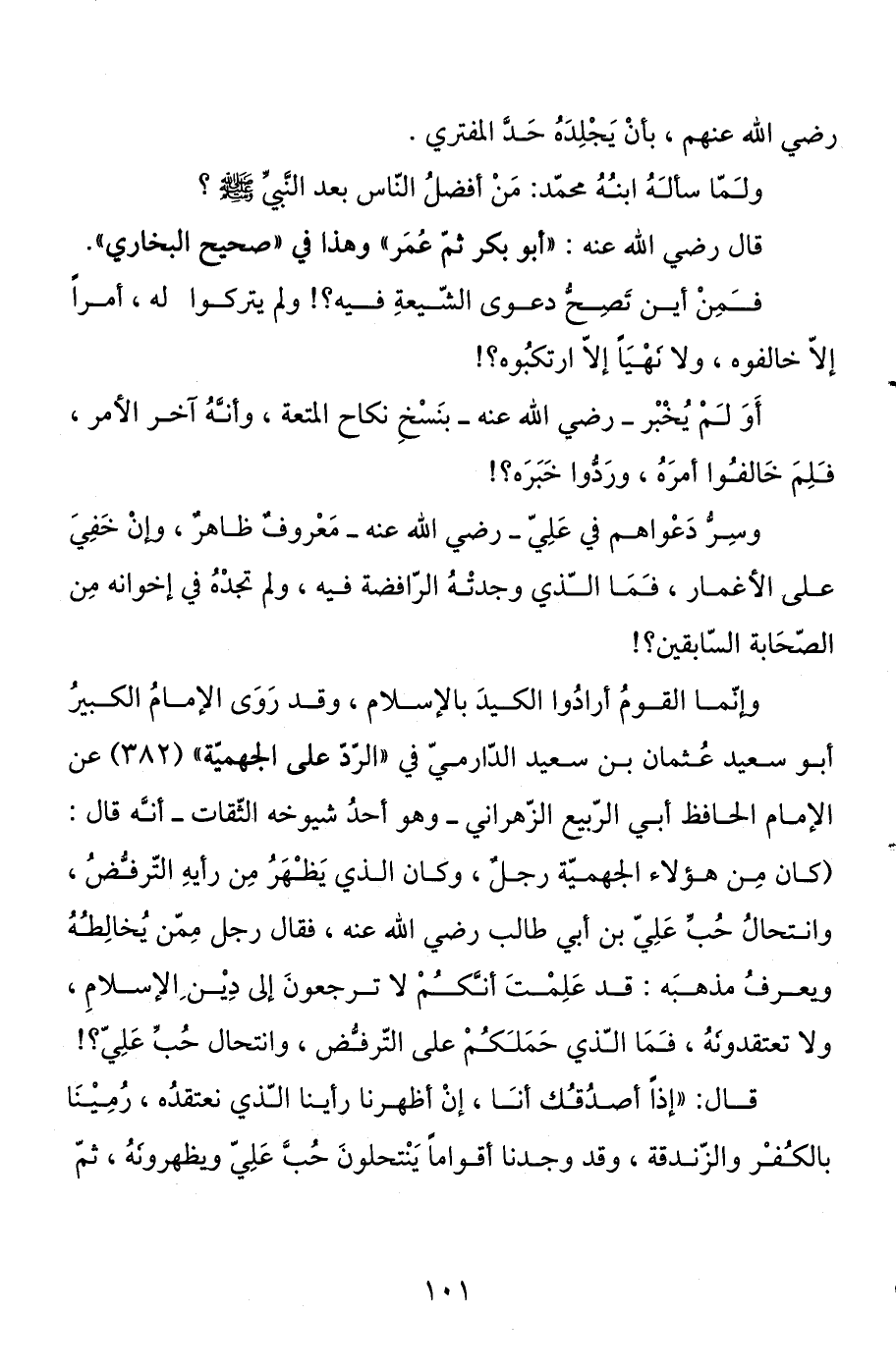 ولما سأله ابنه محمد: من أفضل الناس بعد النبي صلى الله عليه وسلم؟ قال رضي الله عنه: " أبو بكر ثم عمر " وهذا في "صحيح البخاري". فمن أين تصح دعوى الشيعة فيه؟! ولم يتركوا له، أمرا إلا خالفوه، ولا نهيا إلا ارتكبوه؟!