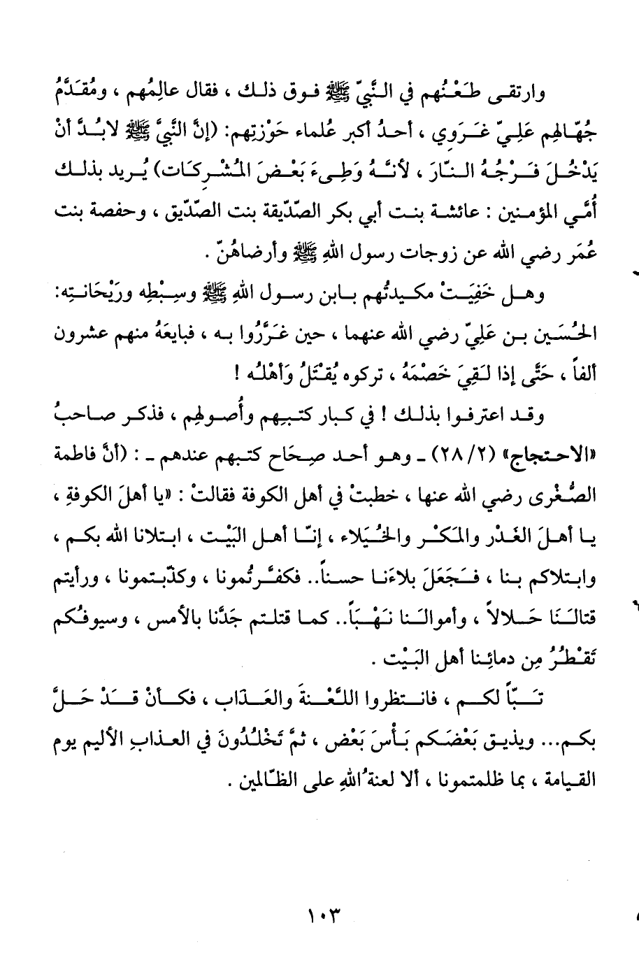 وقد اعترفوا بذلك! في كبار كتبهم وأصولهم، فذكر صاحب "الاحتجاج " (2 / 28) -وهو أحد صحاح كتبهم عندهم-: (أن فاطمة الصغرى رضي الله عنها، خطبت في أهل الكوفة فقالت: "يا أهل الكوفة، يا أهل الغدر والمكر والخيلاء، إنا أهل البيت، ابتلانا الله بكم، وابتلاكم بنا، فجعل بلاءنا حسنا. . فكفرتمونا، وكذبتمونا، ورأيتم قتالنا حلالا، وأموالنا نهبا. . كما قتلتم جدنا بالأمس، وسيوفكم تقطر من دمائنا أهل البيت.