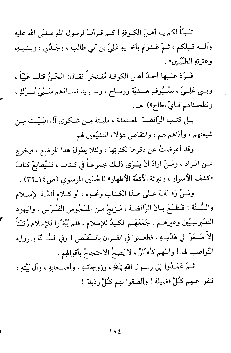 ومن وقف على هذا الكتاب ونحوه، أو كلام أئمة الإسلام والسنة: قطع بأن الرافضة، مزيج من المجوس الفرس، واليهود الطبرسيين وغيرهم. جمعهم الكيد للإسلام، فلم يبقوا للإسلام ركنا إلا سعوا في هدمه، فطعنوا في القرآن بالنقص! وفي السنة برواية النواصب لها! وأنهم كفار، لا يصح الاحتجاج بأقوالهم.