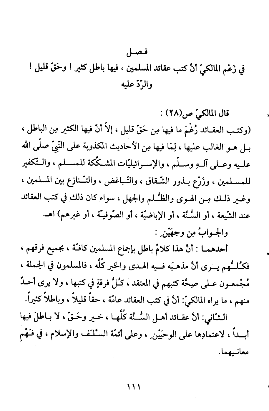 والجواب من وجهين: أحدهما: أن هذا كلام باطل بإجماع المسلمين كافة، بجميع فرقهم، فكلهم يرى أن مذهبه فيه الهدى والخير كله، فالمسلمون في الجملة، مجمعون على صحة كتبهم في المعتقد، كل فرقة في كتبها، ولا يرى أحد منهم، ما يراه المالكي: أن في كتب العقائد عامة، حقا قليلا، وباطلا كثيرا.
