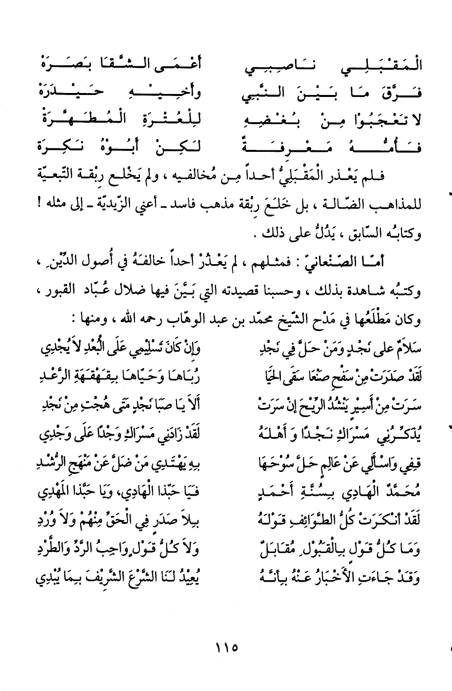 أما الصنعاني: فمثلهم، لم يعذر أحدا خالفه قي أصول الدين، وكتبه شاهدة بذلك، وحسبنا قصيدته التي بين فيها ضلال عباد القبور، وكان مطلعها في مدح الشيخ محمد بن عبد الوهاب رحمه الله، ومنها: