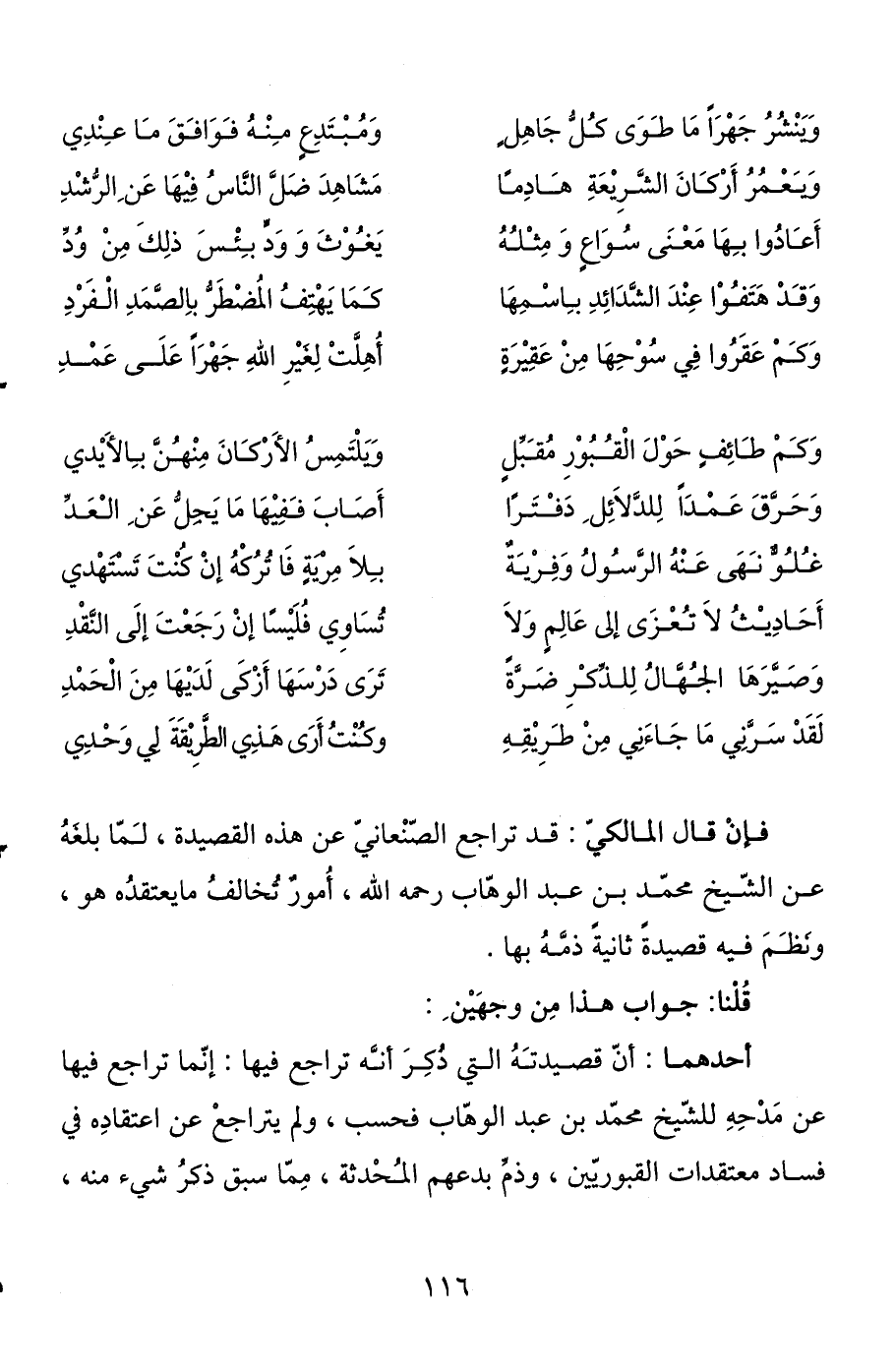 فإن قال المالكي: قد تراجع الصنعاني عن هذه القصيدة، لما بلغه عن الشيخ محمد بن عبد الوهاب رحمه الله، أمور تخالف ما يعتقده هو، ونظم فيه قصيدة ثانية ذمه بها.