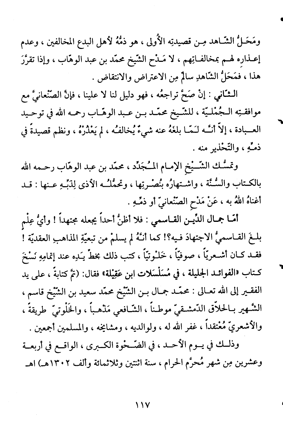 ومحل الشاهد من قصيدته الأولى، هو ذمه لأهل البدع المخالفين، وعدم إعذاره لهم بمخالفاتهم، لا مدح الشيخ محمد بن عبد الوهاب، وإذا تقرر هذا، فمحل الشاهد سالم من الاعتراض والانتقاض.