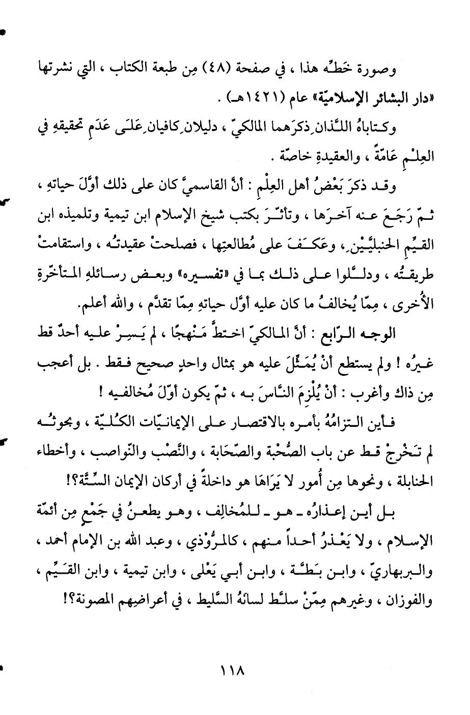 فأين التزامه بأمره بالاقتصار على الإيمانيات الكلية، وبحوثه لم تخرج قط عن باب الصحبة والصحابة، والنصب والنواصب، وأخطاء الحنابلة، ونحوها من أمور لا يراها هو داخلة في أركان الإيمان الستة؟!