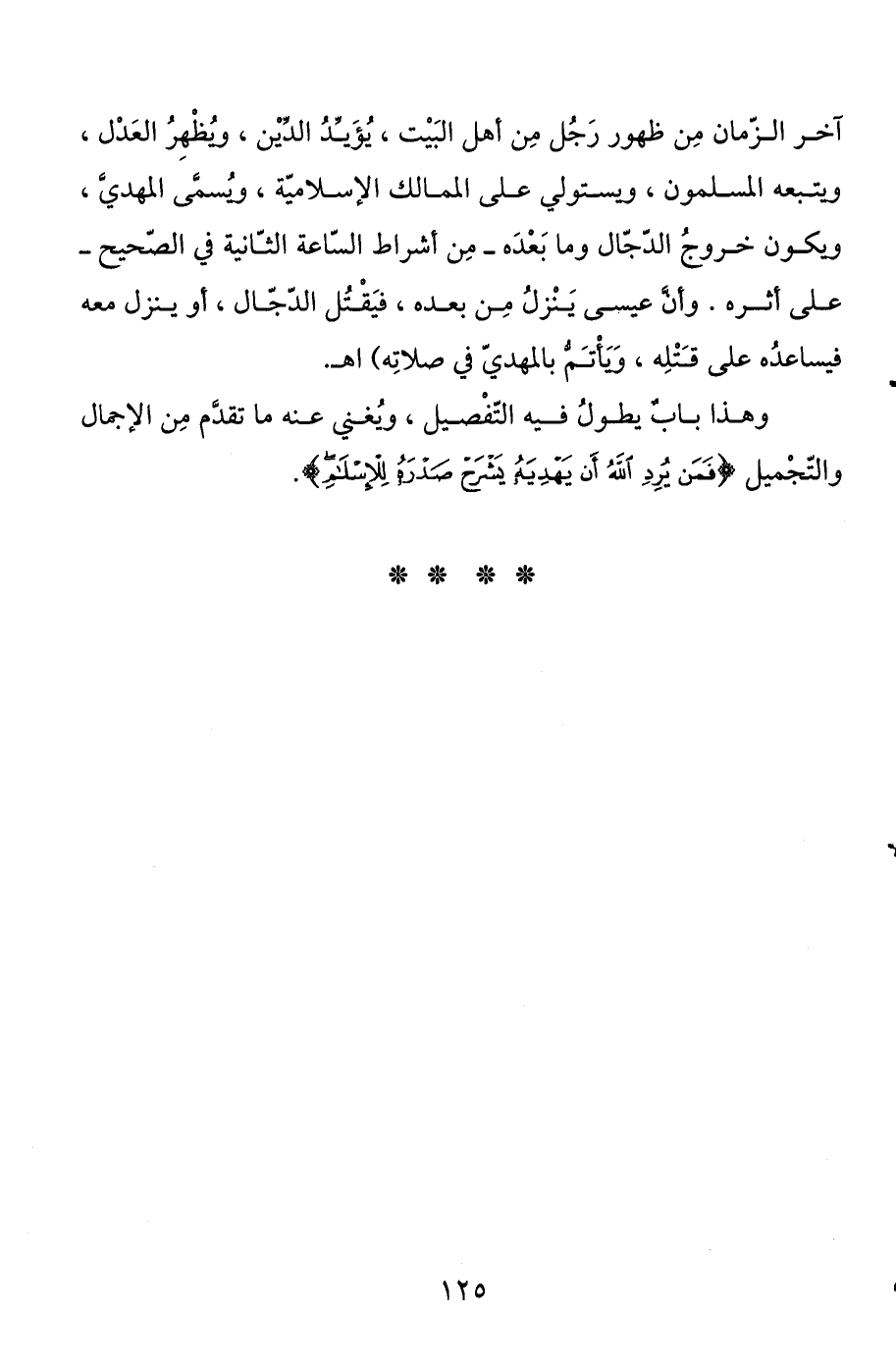 آخر الزمان من ظهور رجل من أهل البيت، يؤيد الدين، ويظهر العدل، ويتبعه المسلمون، ويستولي على الممالك الإسلامية، ويسمى المهدي، ويكون خروج الدجال وما بعده -من أشراط الساعة الثانية في الصحيح- على أثره. وأن عيسى ينزل من بعده، فيقتل الدجال، أو ينزل معه فيساعده على قتله، ويأتم بالمهدي في صلاته) اهـ.
