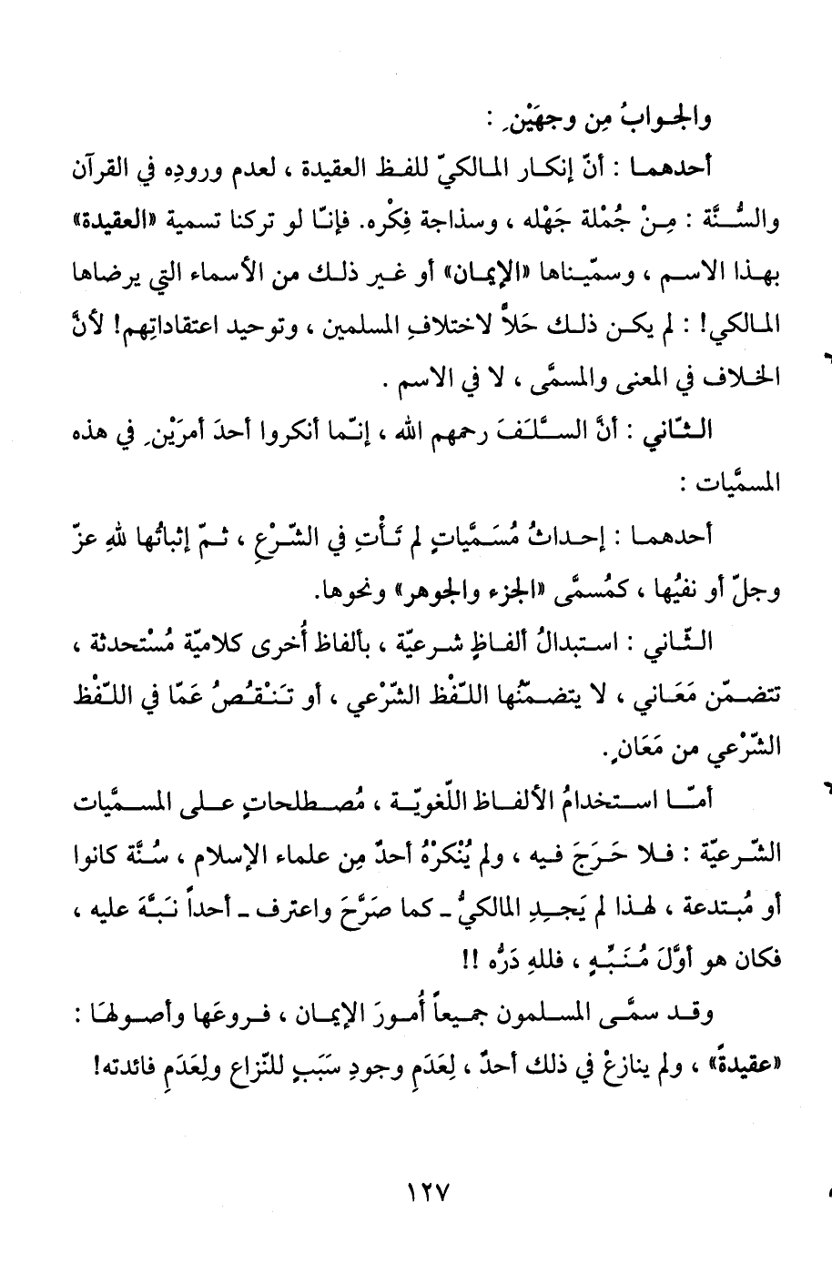 والجواب من وجهين: أحدهما: أن إنكار المالكي للفظ العقيدة، لعدم وروده في القرآن والسنة: من جملة جهله، وسذاجة فكره. فإنا لو تركنا تسمية "العقيدة" بهذا الاسم، وسميناها "الإيمان" أو غير ذلك من الأسماء التي يرضاها المالكي! : لم يكن ذلك حلا لاختلاف المسلمين، وتوحيد اعتقاداتهم؛ لأن الخلاف في المعنى والمسمى، لا في الاسم.