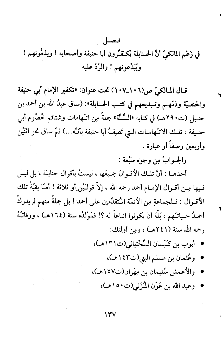 ويبدعونهم! والرد عليه قال المالكي ص (106 - 107) تحت عنوان: " تكفير الإمام أبي حنيفة والحنفية وذمهم وتبديعهم في كتب الحنابلة ": (ساق عبد الله بن أحمد بن حنبل (ت 290 هـ) في كتابه " السنة " جملة من اتهامات وشتائم خصوم أبي حنيفة، تلك الاتهامات التي تصف أبا حنيفة بأنه. . .) ثم ساق نحو اثنين وأربعين وصفا أو عبارة.