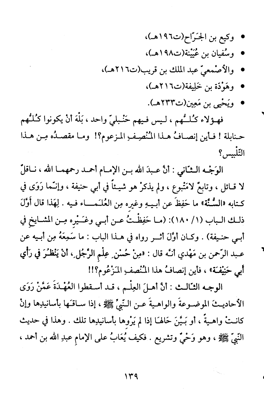 الوجه الثاني: أن عبد الله بن الإمام أحمد رحمهما الله، ناقل لا قائل، وتابع لا متبوع، ولم يذكر هو شيئا في أبي حنيفة، وإنما روى في كتابه " السنة " ما حفظ عن أبيه وغيره من العلماء فيه. لهذا قال أول ذلك الباب (1 / 180) : (ما حفظت عن أبي وغيره من المشايخ في أبي حنيفة) . وكان أول أثر رواه في هذا الباب: ما سمعه من أبيه عن عبد الرحمن بن مهدي أنه قال: " من حسن علم الرجل، أن ينظر في رأي أبي حنيفة "، فأين إنصاف هذا المنصف المزعوم؟ ! !