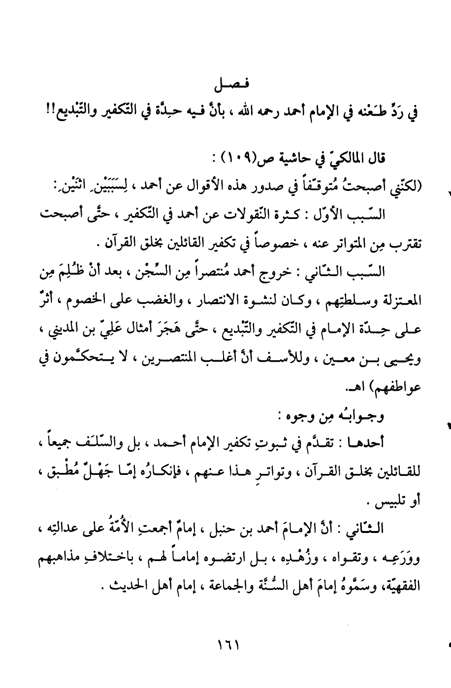 في رد طعنه في الإمام أحمد رحمه الله، بأن فيه حدة في التكفير والتبديع! ! قال المالكي في حاشية ص (109) : (لكنني أصبحت متوقفا في صدور هذه الأقوال عن أحمد، لسببين اثنين: