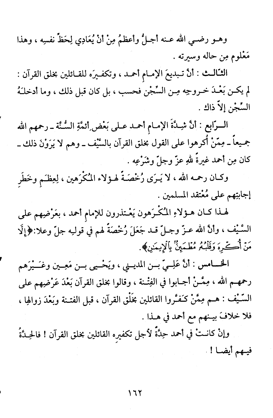 الخامس: أن علي بن المديني، ويحيى بن معين وغيرهم رحمهم الله، ممن أجابوا في الفتنة، وقالوا بخلق القرآن بعد عرضهم على السيف: هم ممن كفروا القائلين بخلق القرآن، قبل الفتنة وبعد زوالها، فلا خلاف بينهم مع أحمد في هذا.