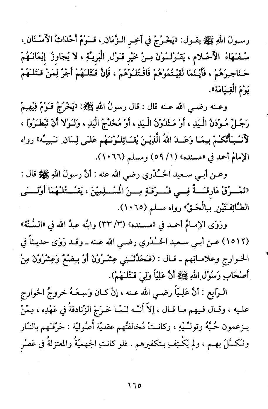 وعنه رضي الله عنه قال: قال رسول الله صلى الله عليه وسلم: «يخرج قوم فيهم رجل مودن اليد، أو مثدون اليد، أو مخدج اليد، ولولا أن تبطروا، لأنبأتكم بما وعد الله الذين يقاتلونهم على لسان نبيه» رواه الإمام أحمد في " مسنده " (1 / 59) ومسلم (1066) .