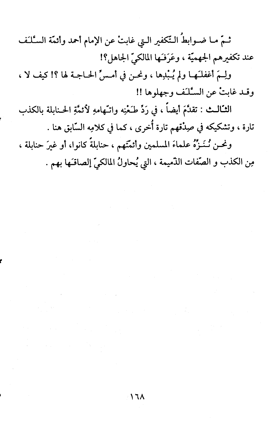 ونحن ننزه علماء المسلمين وأئمتهم، حنابلة كانوا، أو غير حنابلة، من الكذب والصفات الذميمة، التي يحاول المالكي إلصاقها بهم.