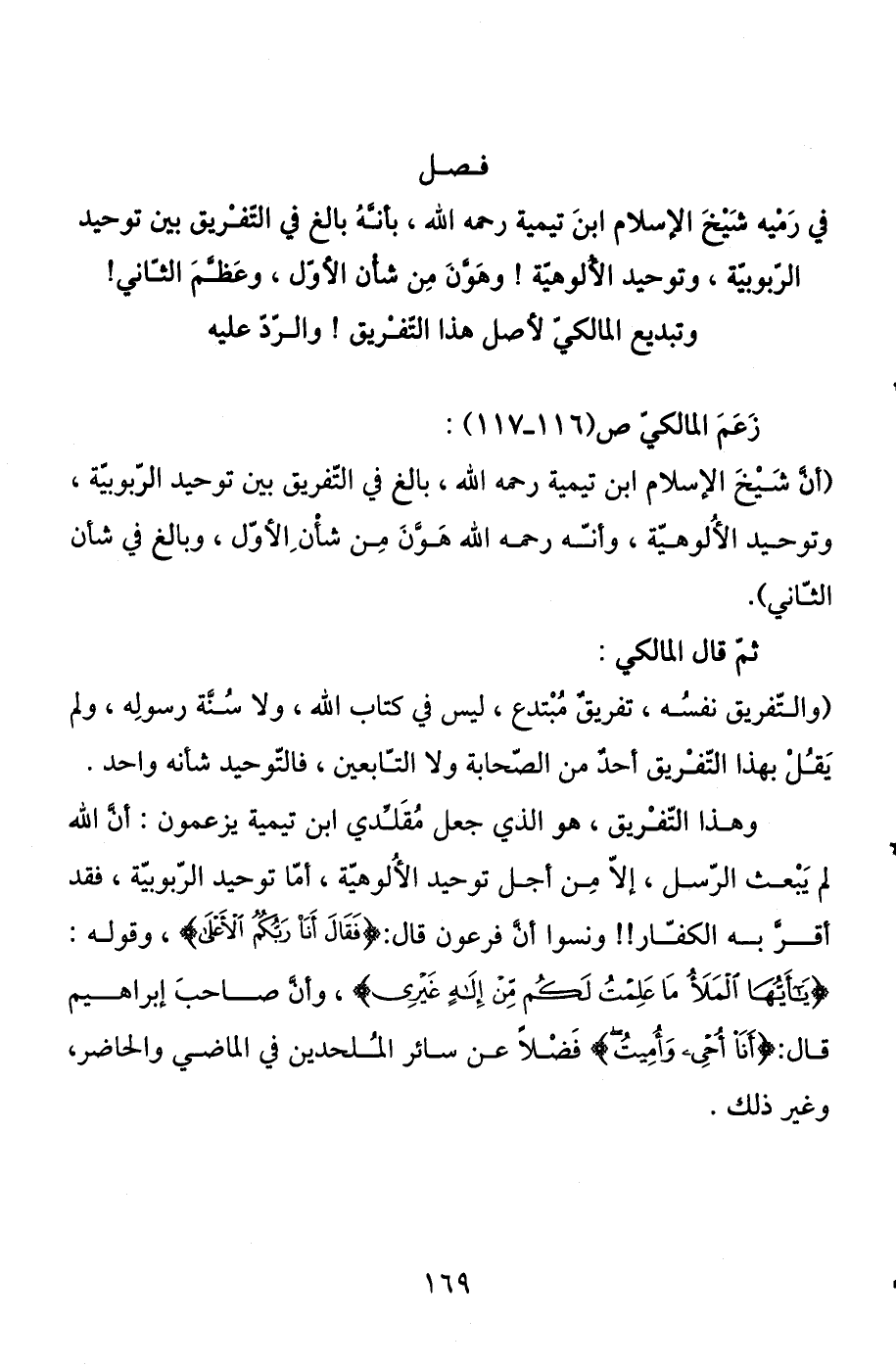 وتبديع المالكي لأصل هذا التفريق! والرد عليه زعم المالكي ص (116 - 117) : (أن شيخ الإسلام ابن تيمية رحمه الله، بالغ في التفريق بين توحيد الربوبية، وتوحيد الألوهية، وأنه رحمه الله هون من شأن الأول، وبالغ في شأن الثاني) .