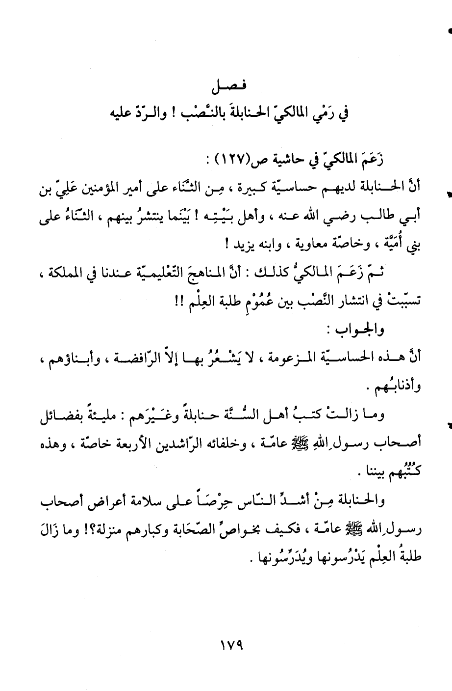 في رمي المالكي الحنابلة بالنصب! والرد عليه زعم المالكي في حاشية ص (127) : أن الحنابلة لديهم حساسية كبيرة، من الثناء على أمير المؤمنين علي بن أبي طالب رضي الله عنه، وأهل بيته! بينما ينتشر بينهم، الثناء على بني أمية، وخاصة معاوية، وابنه يزيد!