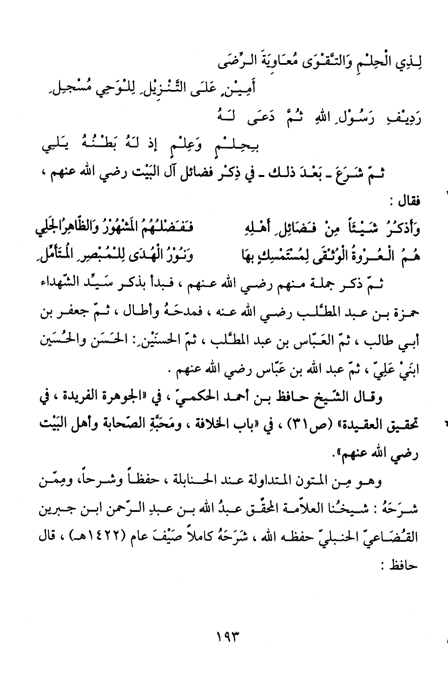 وقال الشيخ حافظ بن أحمد الحكمي، في " الجوهرة الفريدة، في تحقيق العقيدة " (ص 31) ، في " باب الخلافة، ومحبة الصحابة وأهل البيت رضي الله عنهم ".