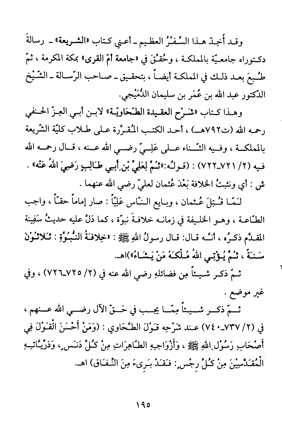 وهذا كتاب " شرح العقيدة الطحاوية " لابن أبي العز الحنفي رحمه الله (ت 792 هـ) ، أحد الكتب المقررة على طلاب كلية الشريعة بالمملكة، وفيه الثناء على علي رضي الله عنه، قال رحمه الله فيه (2 / 721 -722) : (قوله: " ثم لعلي بن أبي طالب رضي الله عنه ". ش: أي ونثبت الخلافة بعد عثمان لعلي رضي الله عنهما.