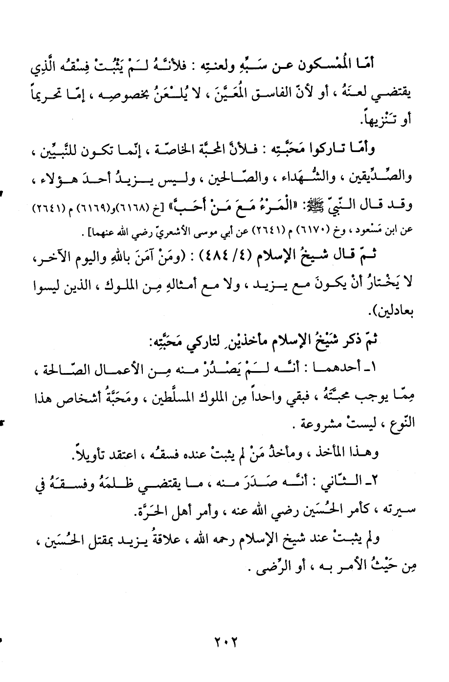 وأما تاركو محبته: فلأن المحبة الخاصة، إنما تكون للنبيين والصديقين والشهداء والصالحين، وليس يزيد أحد هؤلاء، وقد قال النبي صلى الله عليه وسلم: «المرء مع من أحب» [خ (6168) و (6169) م (2641) عن ابن مسعود، وخ (6170) م (2641) عن أبي موسى الأشعري رضي الله عنهما] .