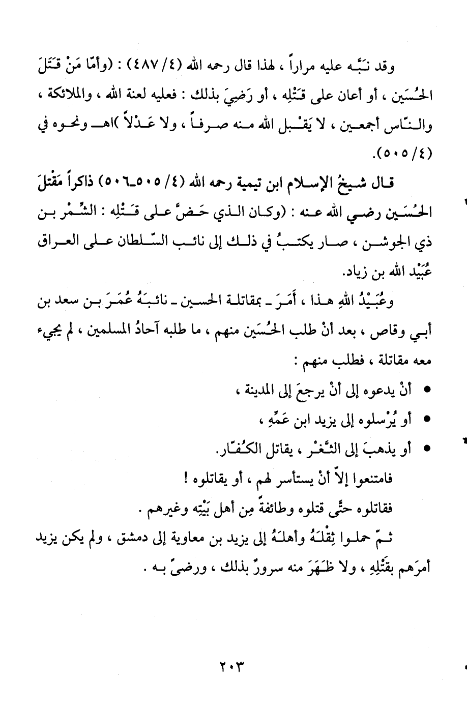 وقد نبه عليه مرارا، لهذا قال رحمه الله (4 / 487) : (وأما من قتل الحسين، أو أعان على قتله، أو رضي بذلك: فعليه لعنة الله والملائكة والناس أجمعين، لا يقبل الله منه صرفا ولا عدلا) اهـ ونحوه في (4 / 505) .