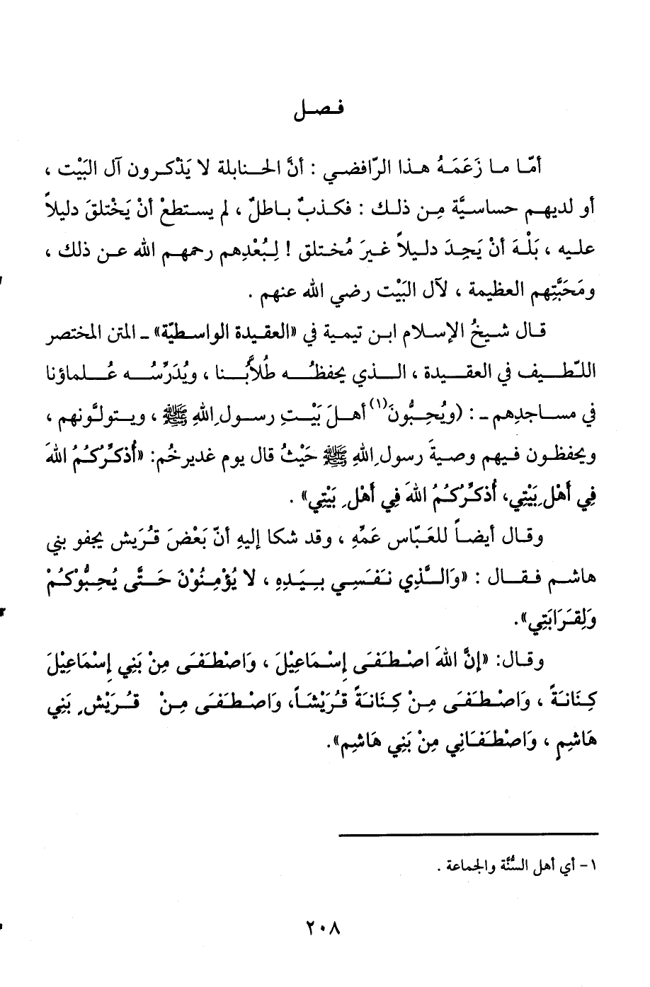 قال شيخ الإسلام ابن تيمية في " العقيدة الواسطية " - المتن المختصر اللطيف في العقيدة، الذي يحفظه طلابنا، ويحرسه علماؤنا في مساجدهم -: ويحبون (¬1) أهل بيت رسول الله صلى الله عليه وسلم، ويتولونهم، ويحفظون فيهم وصية رسول الله صلى الله عليه وسلم حيث قال يوم غديرخم: «أذكركم الله في أهل بيتي، أذكركم الله في أهل بيتي» .