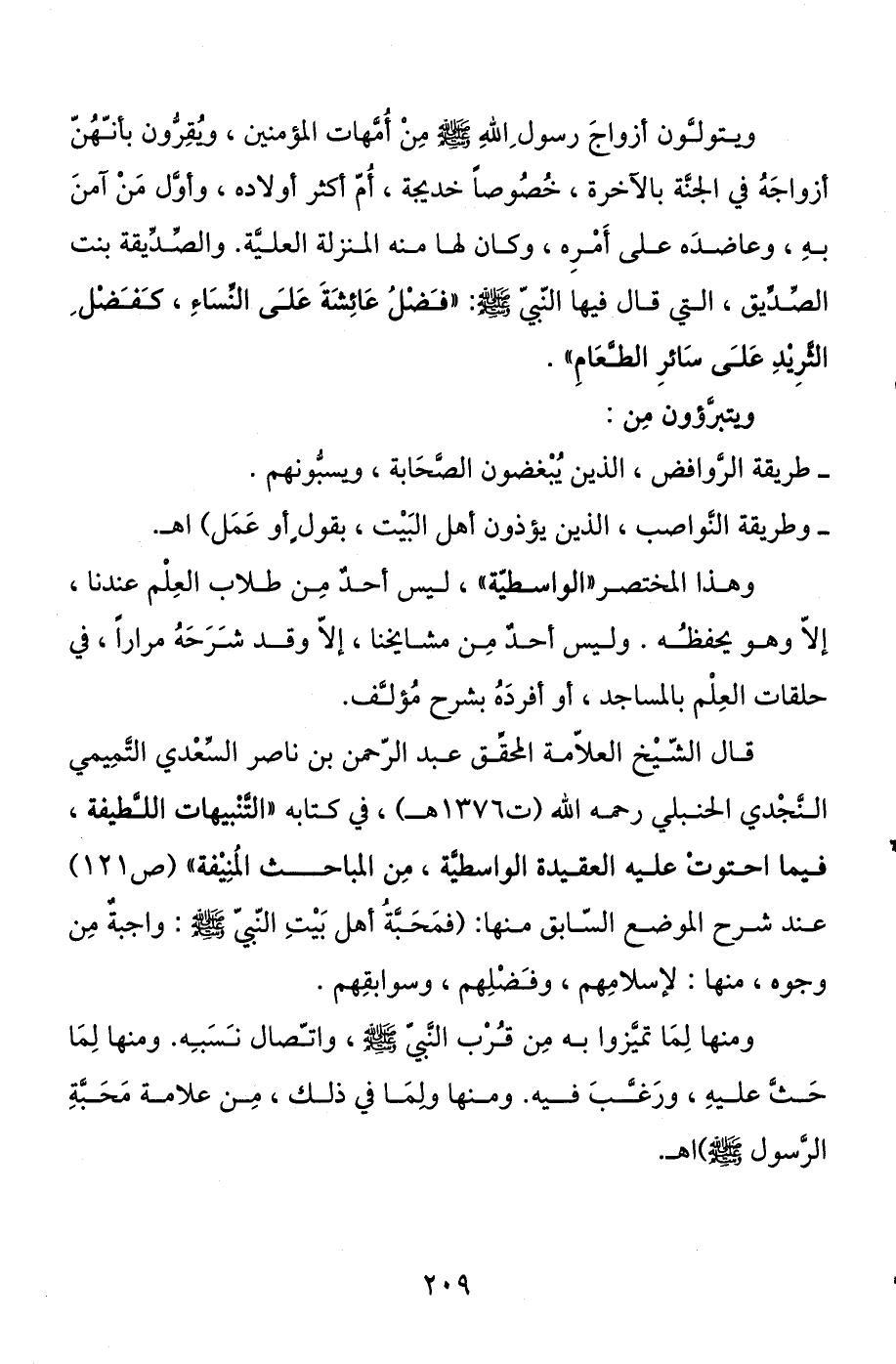 قال الشيخ العلامة المحقق عبد الرحمن بن ناصر السِّعدي التميمي النجدي الحنبلي رحمه الله (ت 1376 هـ) ، في كتابه " التنبيهات اللطيفة، فيما احتوت عليه العقيدة الواسطية، من المباحث المنيفة " (ص 121) عند شرح الموضع السابق منها: (فمحبة أهل بيت النبي صلى الله عليه وسلم واجبة من وجوه، منها: لإسلامهم، وفضلهم، وسوابقهم) .