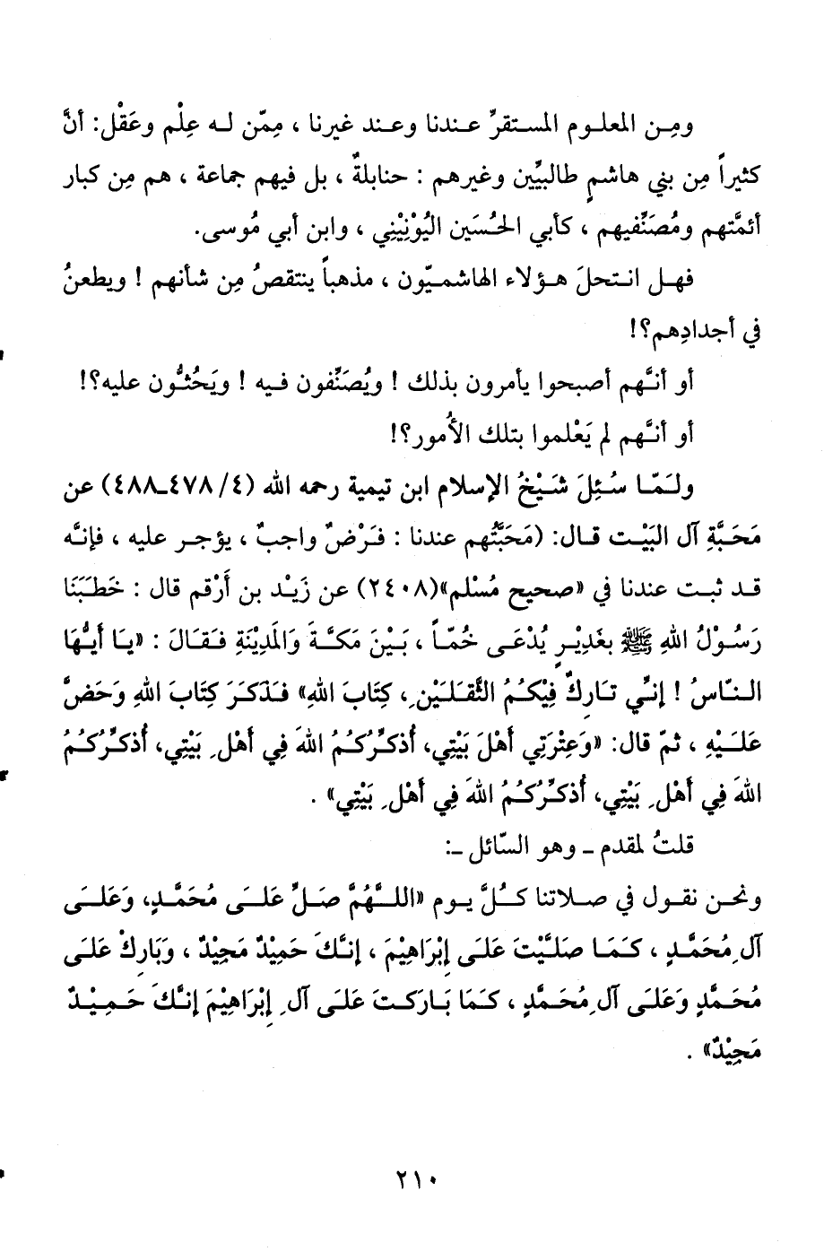 ولما سئل شيخ الإسلام ابن تيمية رحمه الله (4 / 478 - 488) عن محبة آل البيت قال: (محبتهم عندنا: فرض واجب، يؤجر عليه، فإنه قد ثبت عندنا في " صحيح مسلم " (2408) عن زيد بن أرقم قال: «خطبنا رسول الله صلى الله عليه وسلم بغدير يدعى خما، بين مكة والمدينة فقال: " يا أيها الناس! إني تارك فيكم الثقلين، كتاب الله " فذكر كتاب الله وحض عليه، ثم قال: "وعترتي أهل بيتي، أذكركم الله في أهل بيتي، أذكركم الله في أهل بيتي، أذكركم الله في أهل بيتي» .