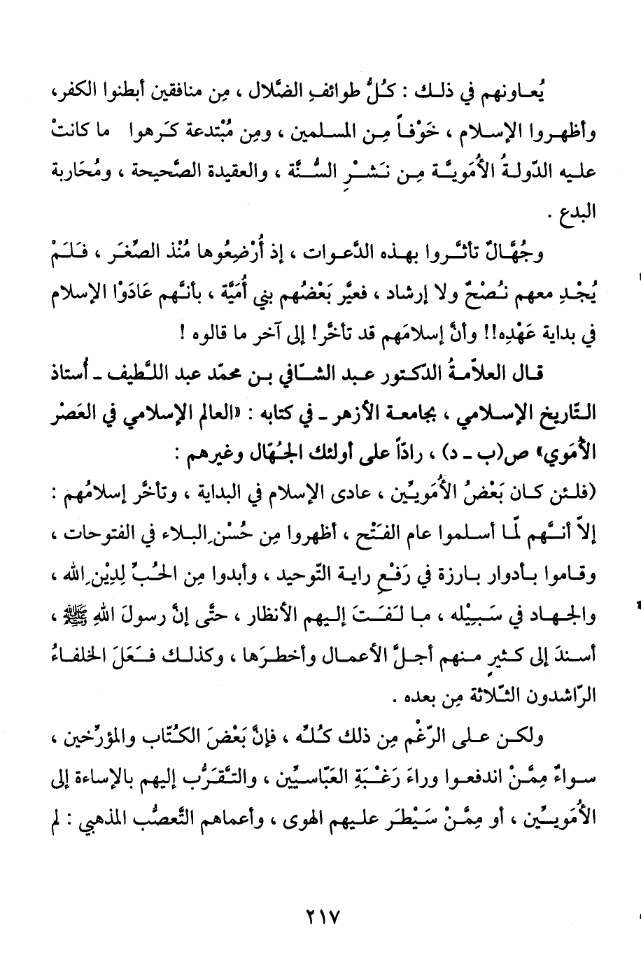 قال العلامة الدكتور عبد الشافي بن محمد عبد اللطيف - أستاذ التاريخ الإسلامي، بجامعة الأزهر - في كتابه: " العالم الإسلامي في العصر الأموي " ص (ب - د) ، رادا على أولئك الجهال وغيرهم: (فلئن كان بعض الأمويين، عادى الإسلام في البداية، وتأخر إسلامهم: إلا أنهم لما أسلموا عام الفتح، أظهروا من حسن البلاء في الفتوحات، وقاموا بأدوار بارزة في رفع راية التوحيد، وأبدوا من الحب لدين الله والجهاد في سبيله ما لفت إليهم الأنظار، حتى إن رسول الله صلى الله عليه وسلم أسند إلى كثير منهم أجل الأعمال وأخطرها، وكذلك فعل الخلفاء الراشدون الثلاثة من بعده.