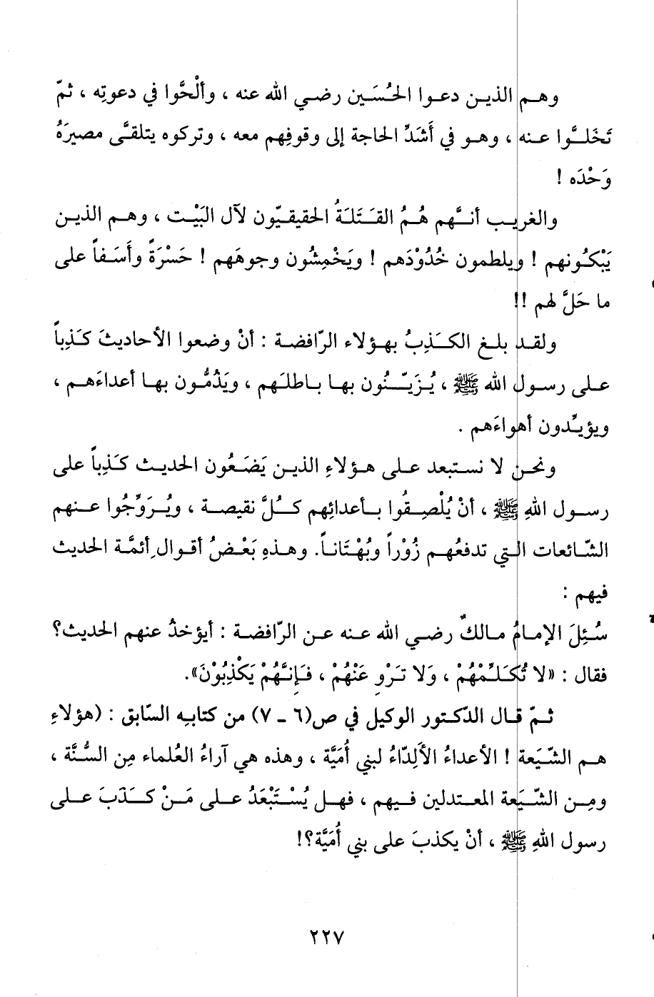 سئل الإمام مالك رضي الله عنه عن الرافضة أيؤخذ عنهم الحديث؟ فقال: " لا تكلمهم، ولا ترو عنهم، فإنهم يكذبون ".
