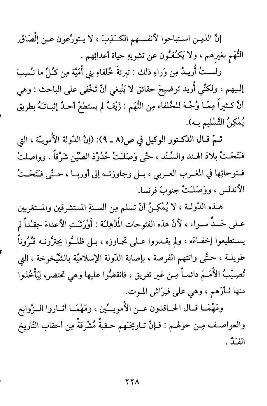 ثم قال الدكتور الوكيل في ص (8- 9) : (إن الدولة الأموية التي فتحت بلاد الهند والسند، حتى وصلت حدود الصين شرقا، وواصلت فتوحاتها في المغرب العربي، بل وجاوزته إلى أوربا، حتى فتحت الأندلس، ووصلت جنوب فرنسا.