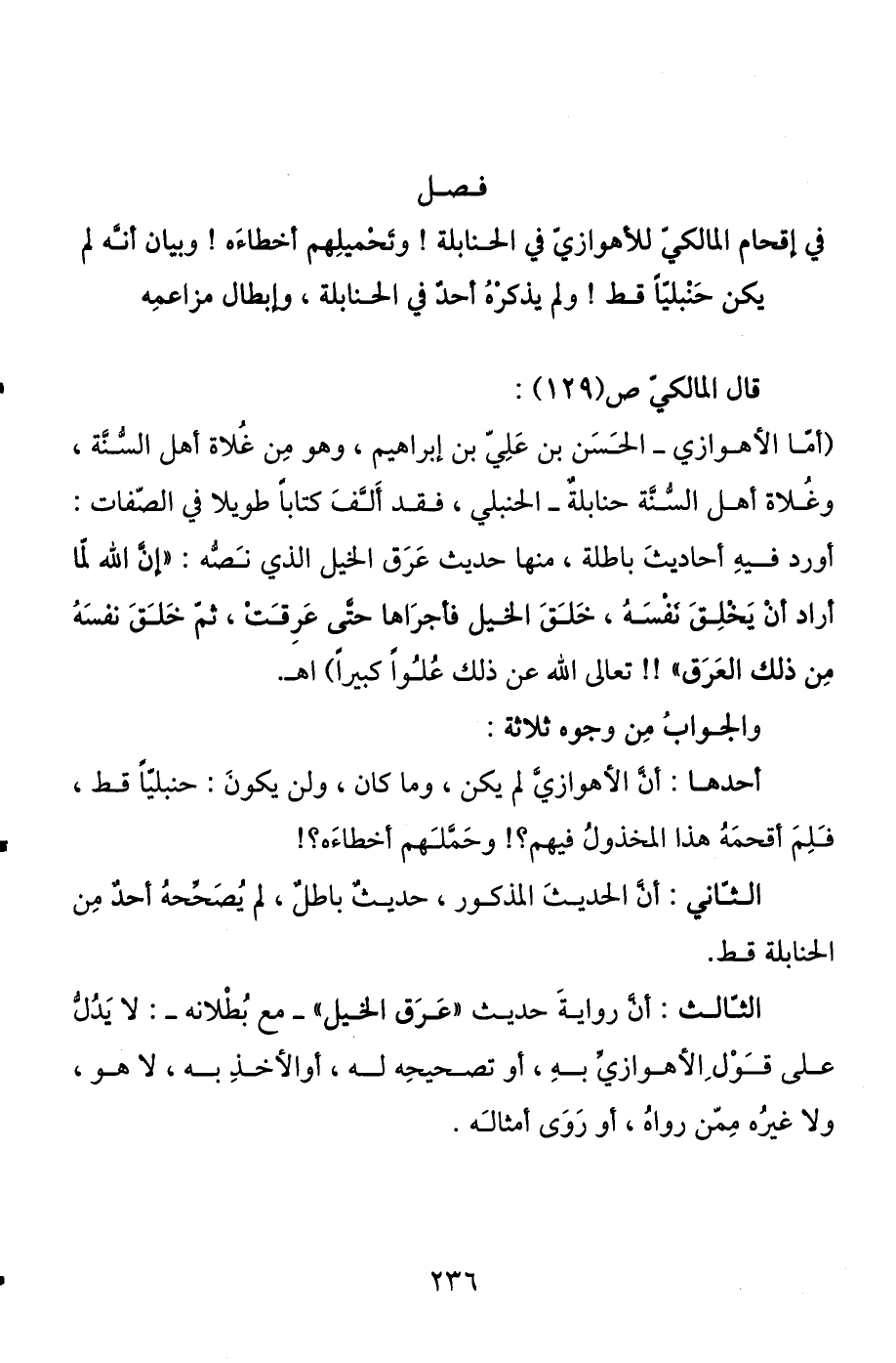 وبيان أنه لم يكن حنبليا قط ولم يذكره أحذ في الحنابلة، وإبطال مزاعمه قال المالكي ص (129) : (أما الأهوازي- الحسن بن علي بن إبراهيم، وهو من غلاة أهل السنة، وغلاة أهل السنة حنابلة- الحنبلي، فقد ألف كتابا طويلا في الصفات، أورد فيه أحاديث باطلة، منها حديث عرق الخيل الذي نصه: " إن الله لما أراد أن يخلق نفسه، خلق الخيل فأجراها حتى عرقت، ثم خلق نفسه من ذلك العرق". تعالى الله عن ذلك علوا كبيرا) اهـ.