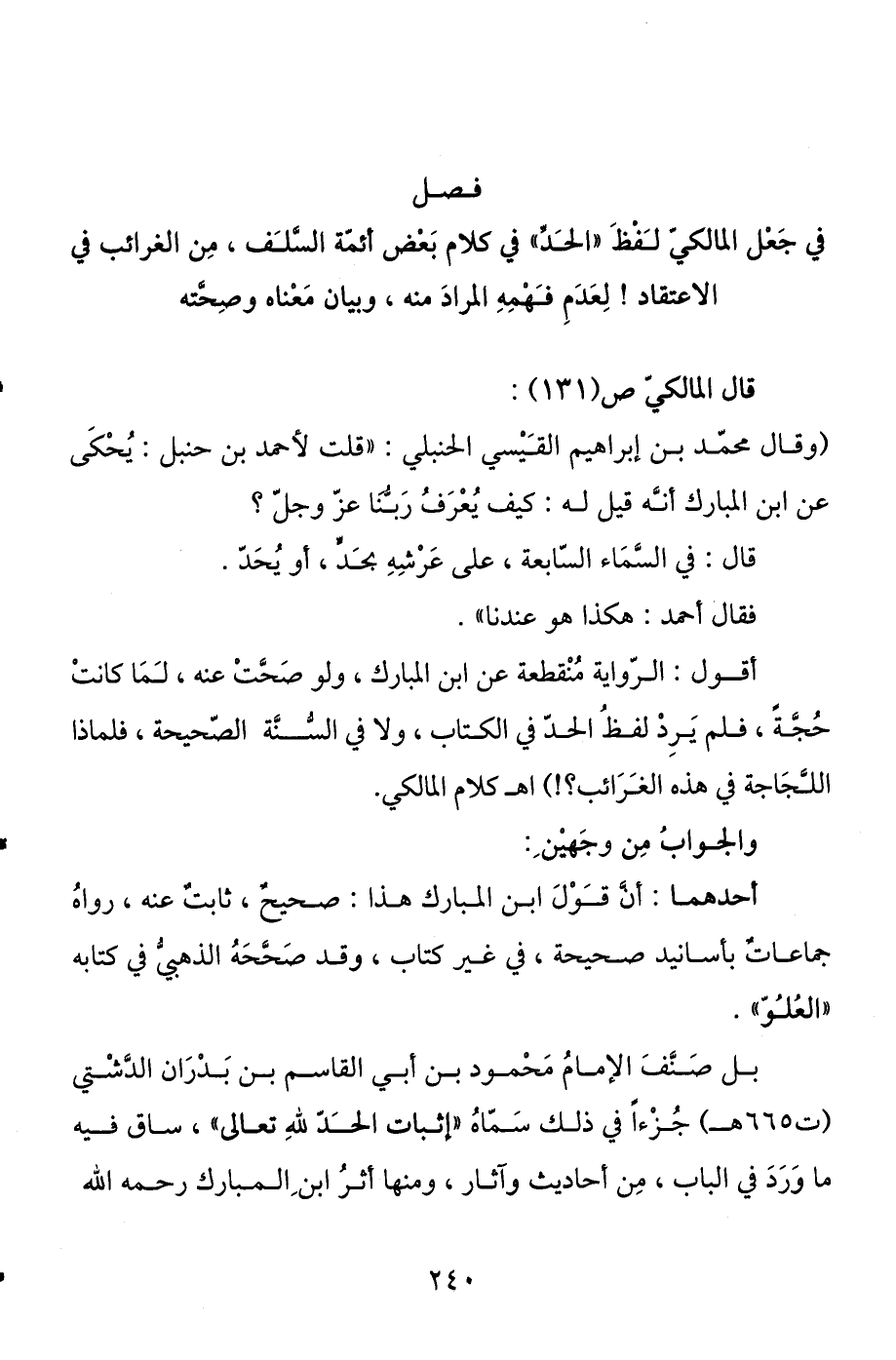 في جعل المالكي لفظ "الحد" في كلام بعض أئمة السلف، من الغرائب في الاعتقاد، لعدم فهمه المراد منه، وبيان معناه وصحته قال المالكي ص (131) : (وقال محمد بن إبراهيم القيسي الحنبلي: " قلت لأحمد بن حنبل: يحكى عن ابن المبارك أنه قيل له: كيف يعرف ربنا عز وجل؟