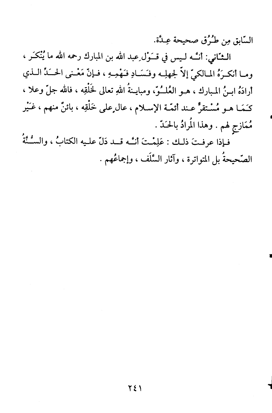 الثاني: أنه ليس في قول عبد الله بن المبارك رحمه الله ما ينكر، وما أنكره المالكي إلا لجهله وفساد فهمه، فإن معنى الحد الذي أراده ابن المبارك، هو العلو، ومباينة الله تعالى لخلقه، فالله جل وعلا، كما هو مستقر عند أئمة الإسلام، عال على خلقه، بائن منهم، غير ممازج لهم. وهذا المراد بالحد.
