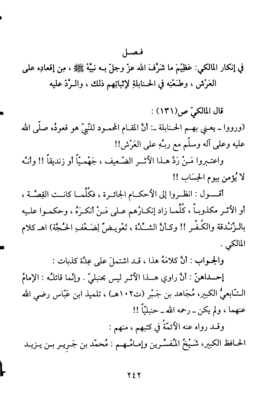 وطعنه في الحنابلة لإثباتهم ذلك، والرد عليه قال المالكي ص (131) : (ورووا- يعني بهم الحنابلة - أن المقام المحمود للنبي هو قعوده صلى الله عليه وعلى آله وسلم مع ربه على العرش.