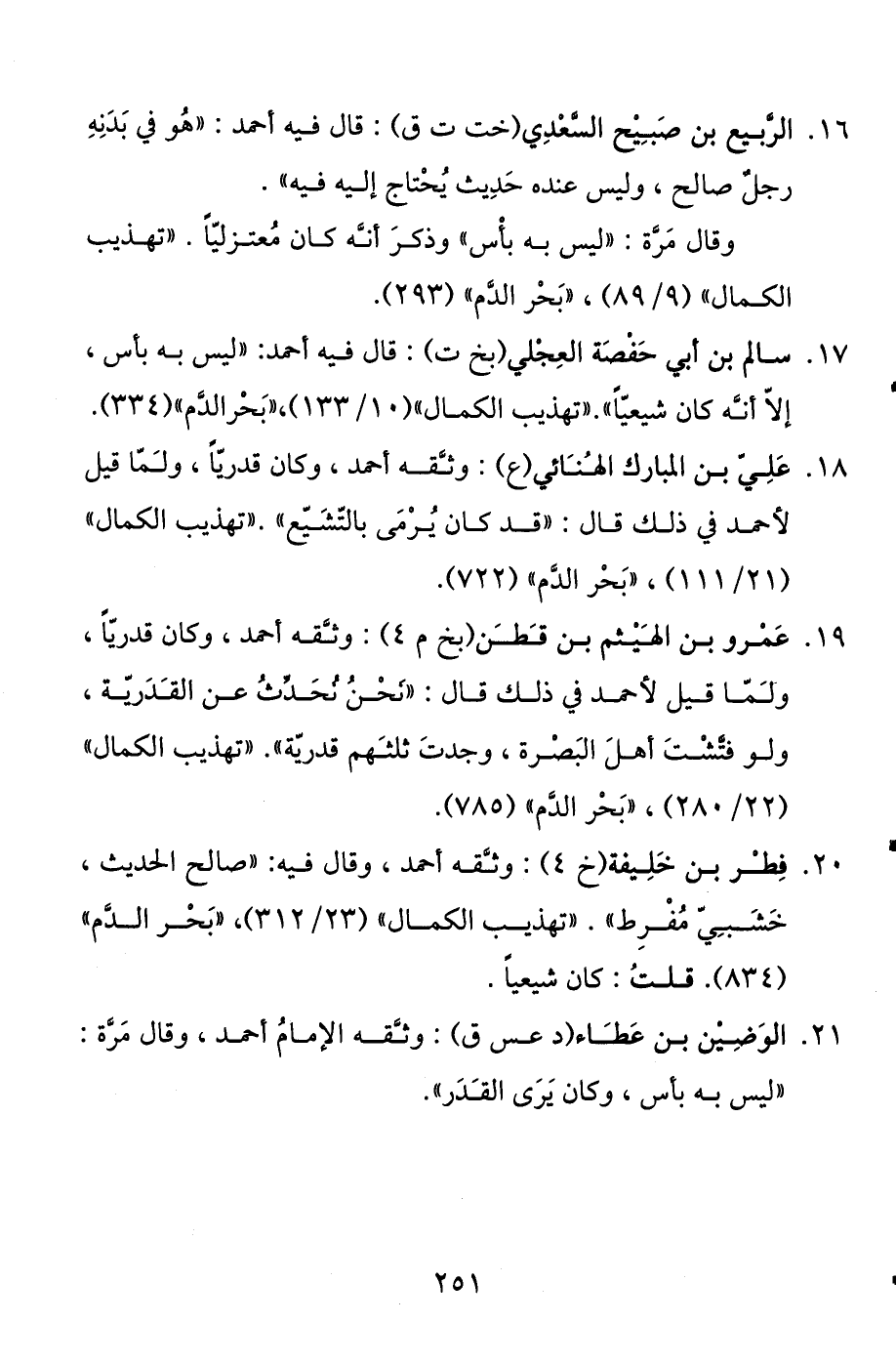 18 -. علي بن المبارك الهنائي (ع) : وثقه أحمد، وكان قدريا، ولما قيل لأحمد في ذلك قال: "قد كان يرمى بالتشيع ". "تهذيب الكمال " (21 / 111) ، " بحر الدم " (722) .
