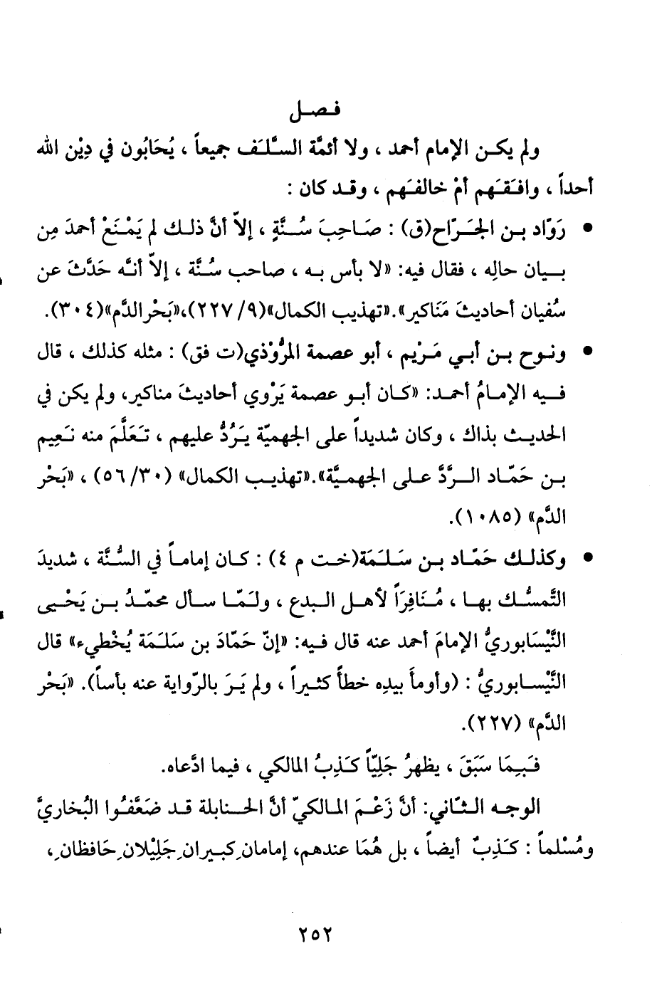 . وكذلك حماد بن سلمة (خت م 4) : كان إماما في السنة، شديد التمسك بها، منافرا لأهل الباع، ولما سأل محمد بن يحيى النيسابوري الإمام أحمد عنه قال فيه: "إن حماد بن سلمة يخطئ" قال النيسابوري: (وأومأ بيده خطأ كثيرا، ولم ير بالرواية عنه بأسا) . "بحر الدم " (227) .