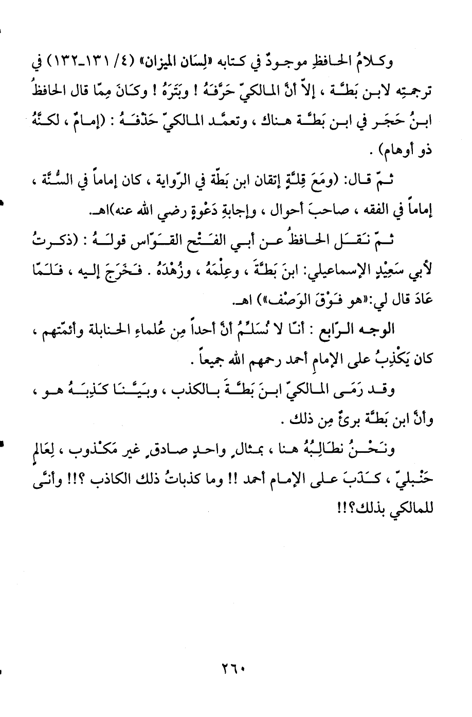 وكلام الحافظ موجود في كتابه "لسان الميزان " (4 / 131 - 132) في ترجمته لابن بطة، إلا أن المالكي حرفه وبتره، وكان مما قال الحافظ ابن حجر في ابن بطة هناك، وتعمد المالكي حذفه: (إمام، لكنه ذو أوهام) .