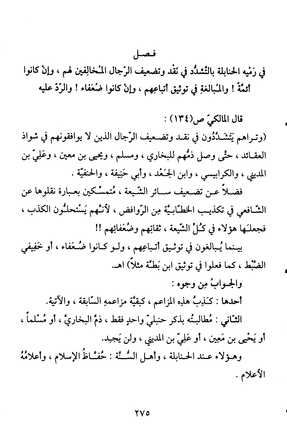 الثاني: مطالبته بذكر حنبلي واحد فقط ذم البخاري، أو مسلما، أو يحيى بن معين، أو علي بن المديني، ولن يجد.