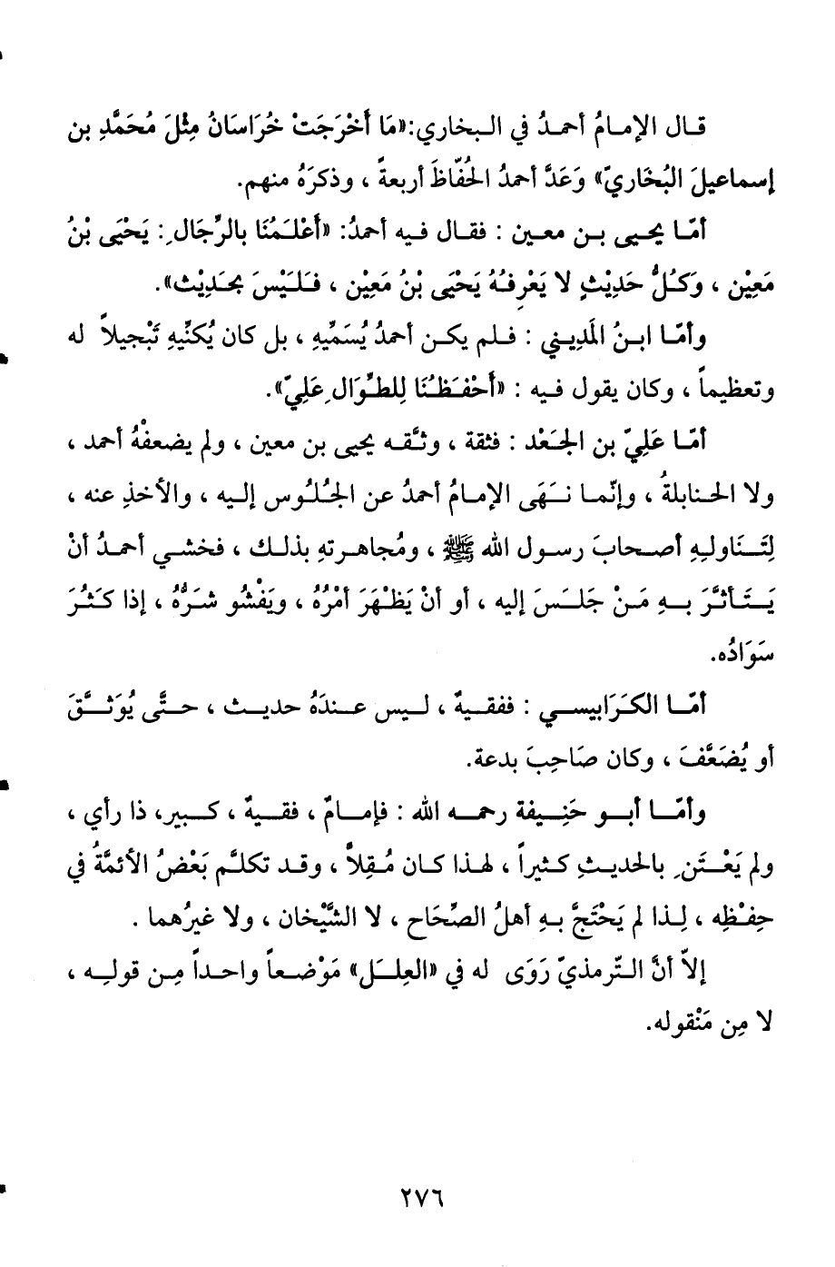 وأما أبو حنيفة رحمه الله: فإمام، فقية، كبير، ذا رأي، ولم يعتن بالحديث كثيرا لهذا كان مقلا، وقد تكلم بعض الأئمة في حفظه، لذا لم يحتج به أهل الصحاح، لا الشيخان، ولا غيرهما.