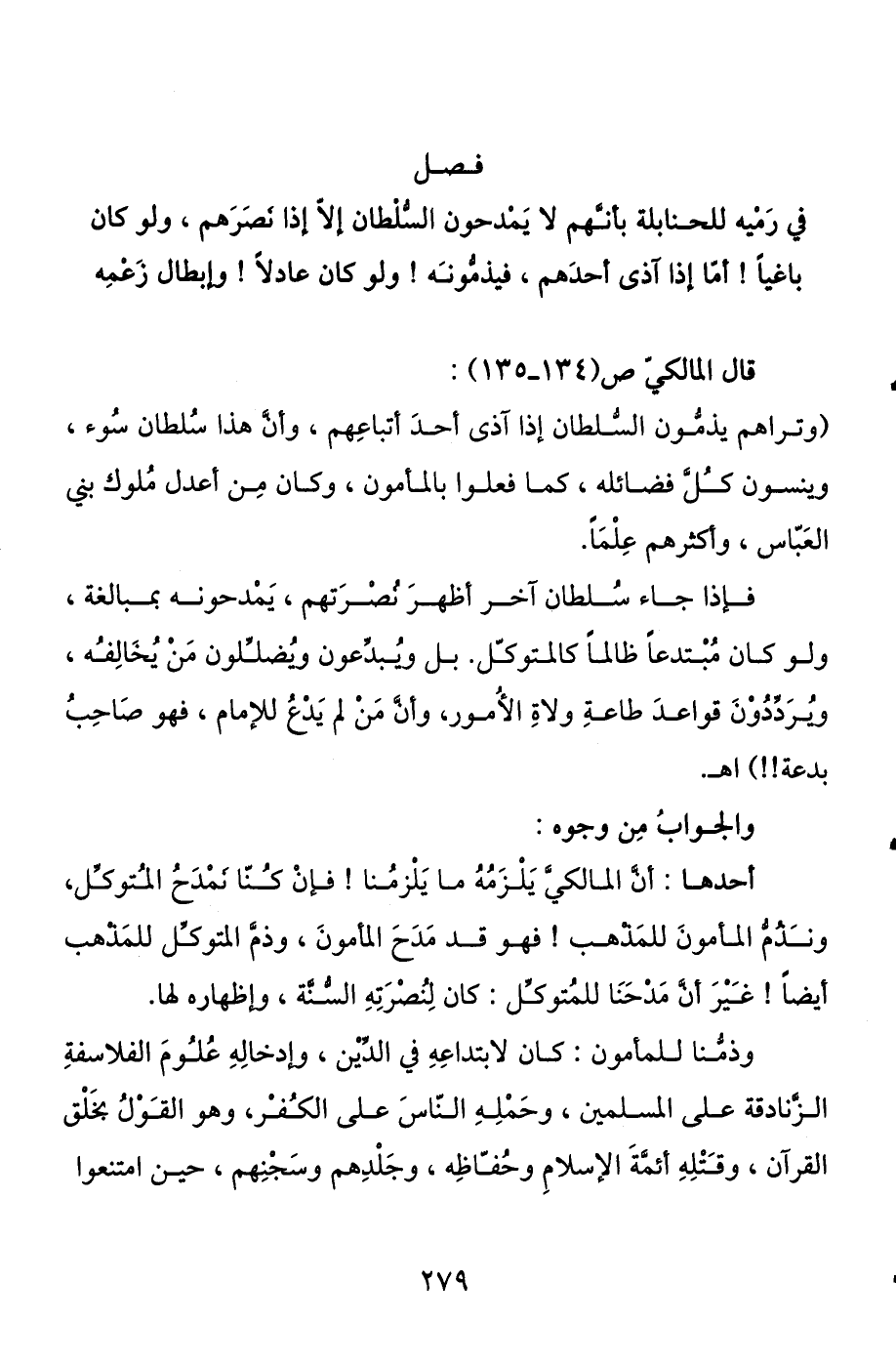 والجواب من وجوه: أحدها: أن المالكي يلزمه ما يلزمنا، فإن كنا نمدح المتوكل، ونذم المأمون للمذهب، فهو قد مدح المأمون، وذم المتوكل للمذهب أيضا! غير أن مدحنا للمتوكل: كان لنصرته السنة، وإظهاره لها. وذمنا للمأمون: كان لابتداعه في الدين، وإدخاله علوم الفلاسفة الزنادقة على المسلمين، وحمله الناس على الكفر، وهو القول بخلق القرآن، وقتله أئمة الإسلام وحفاظه، وجلدهم وسجنهم، حين امتنعوا