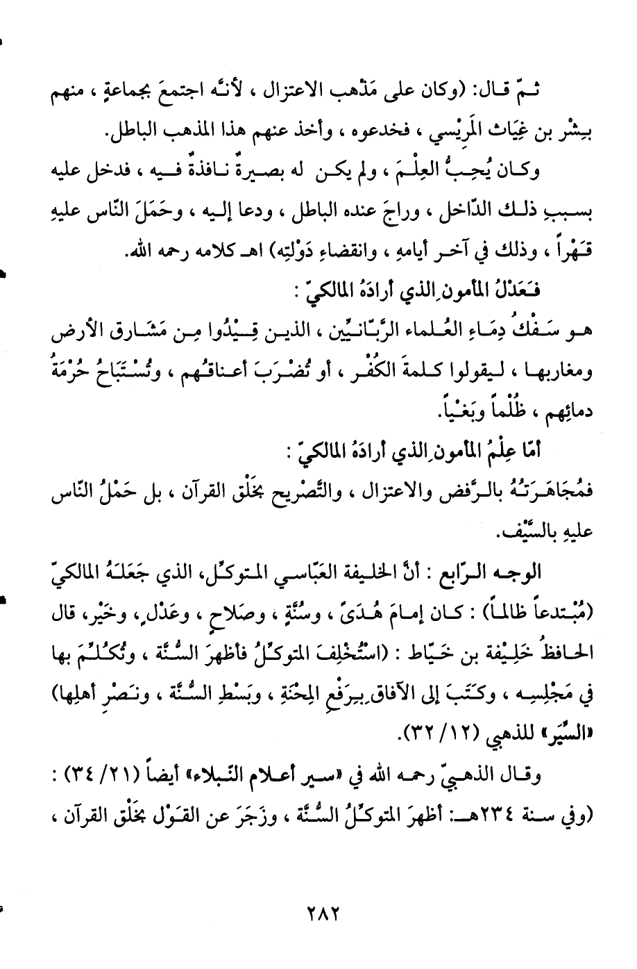 الوجه الرابع: أن الخليفة العباسي المتوكل، الذي جعله المالكي (مبتدعا ظالما) : كان إمام هدى، وسنة، وصلاح، وعدل، وخير، قال الحافظ خليفة بن خياط: (استخلف المتوكل فأظهر السنة، وتكلم بها في مجلسه، وكتب إلى الآفاق برفع المحنة، وبسط السنة، ونصر أهلها) " السير " للذهبي (12 / 32) .