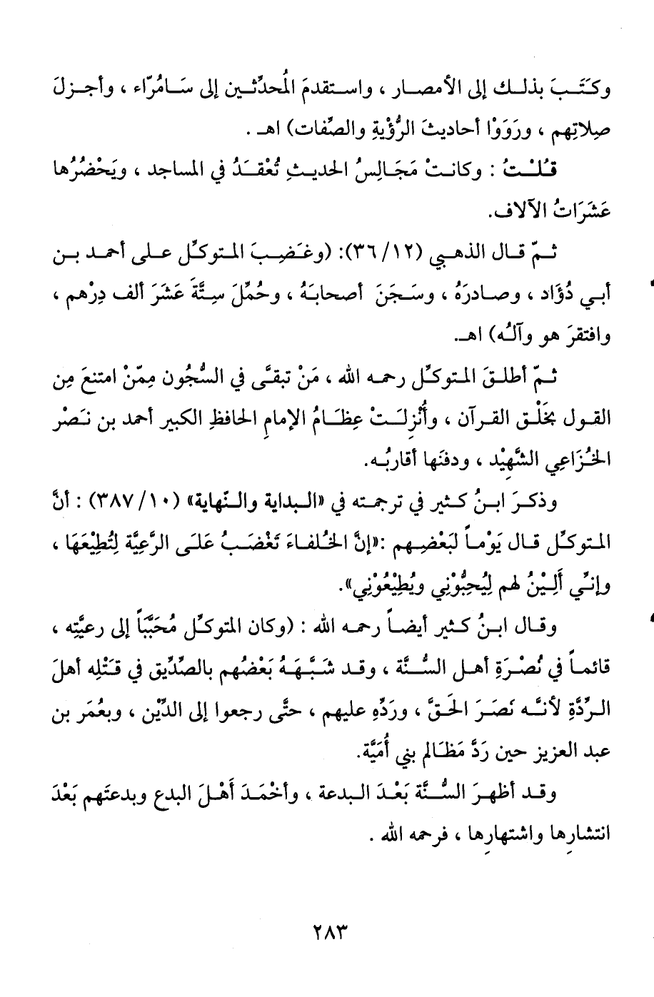 وكتب بذلك إلى الأمصار، واستقدم المحدثين إلى سامراء، وأجزل صلاتهم، ورووا أحاديث الرؤية والصفات) اهـ.