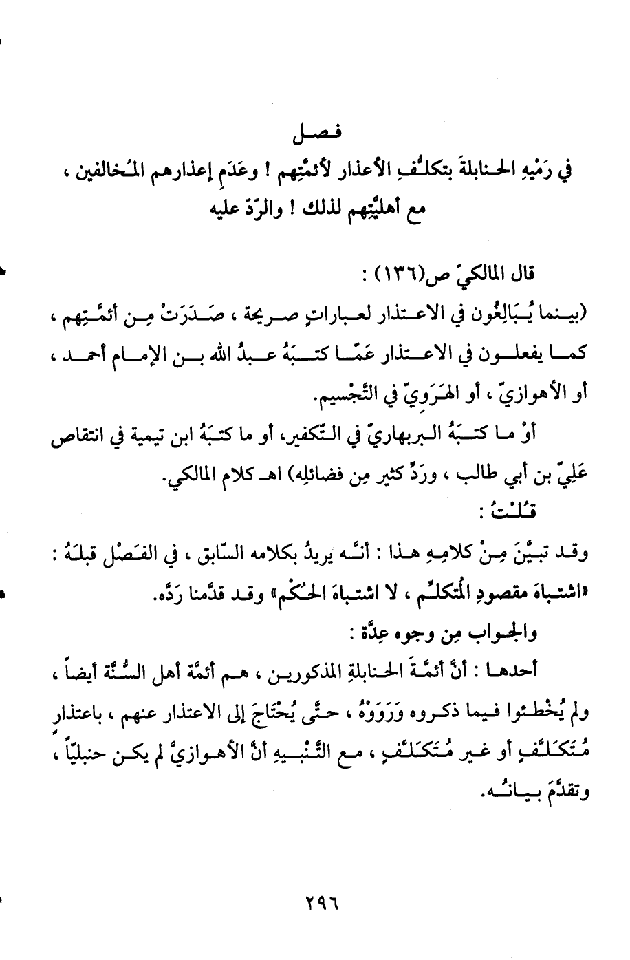 وعدم إعذارهم المخالفين مع أهليتهم لذلك، والرد عليه قال المالكي ص (136) : (بينما يبالغون في الاعتذار لعبارات صريحة صدرت من أئمتهم، كما يفعلون في الاعتذار عما كتبه عبد الله بن الإمام أحمد، أو الأهوازي، أو الهروي في التجسيم.