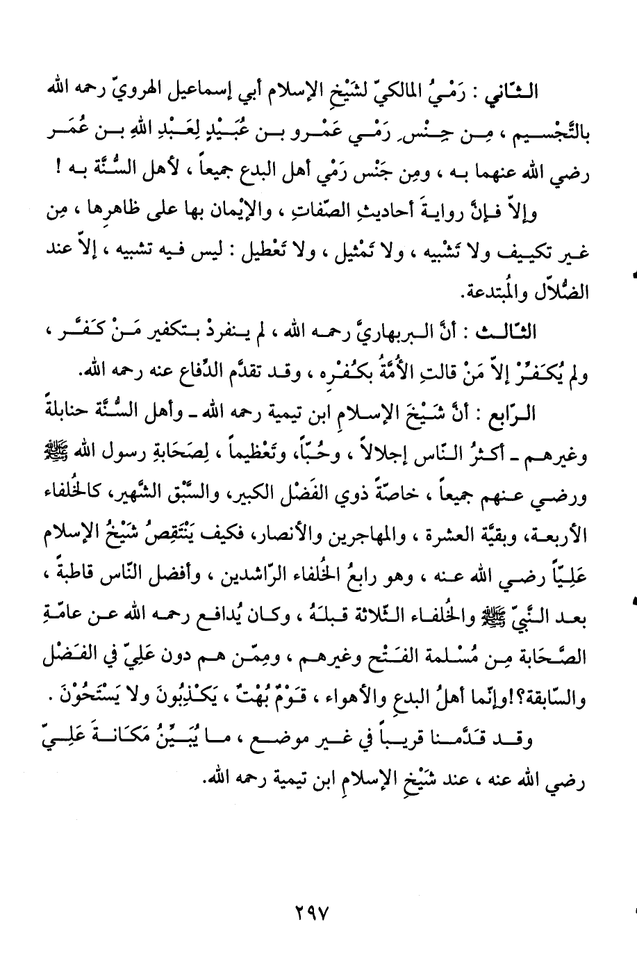 الرابع: أن شيخ الإسلام ابن تيمية رحمه الله- وأهل السنة حنابلة وغيرهم- أكثر الناس إجلالا، وحبا، وتعظيما، لصحابة رسول الله صلى الله عليه وسلم ورضي عنهم جميعا، خاصة ذوي الفضل الكبير، والسبق الشهير، كالخلفاء الأربعة، وبقية العشرة، والمهاجرين والأنصار، فكيف ينتقص شيخ الإسلام عليا رضي الله عنه، وهو رابع الخلفاء الراشدين، وأفضل الناس قاطبة بعد النبي صلى الله عليه وسلم والخلفاء الثلاثة قبله، وكان يدافع رحمه الله عن عامة الصحابة من مسلمة الفتح وغيرهم، وممن هم دون علي في الفضل والسابقة؟! وإنما أهل البدع والأهواء قوم بهت، يكذبون ولا يستحون.