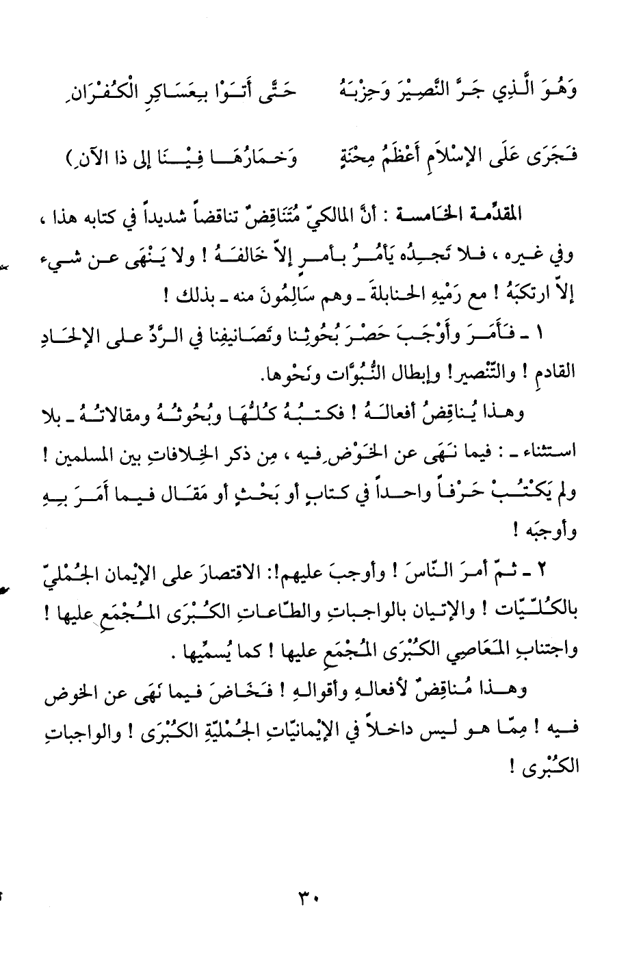 المقدمة الخامسة: أن المالكي متناقض تناقضا شديدا في كتابه هذا، وفي غيره، فلا تجده يأمر بأمر إلا خالفه! ولا ينهى عن شيء إلا ارتكبه! مع رميه الحنابلة - وهم سالمون منه - بذلك!