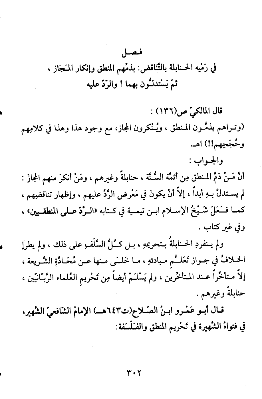 في رميه الحنابلة بالتناقض بذمهم المنطق وإنكار المجاز، ثم يستدلون بهما، والرد عليه قال المالكي ص (136) : (وتراهم يذمون المنطق، وينكرون المجاز، مع وجود هذا وهذا في كلامهم وحججهم.) اهـ.
