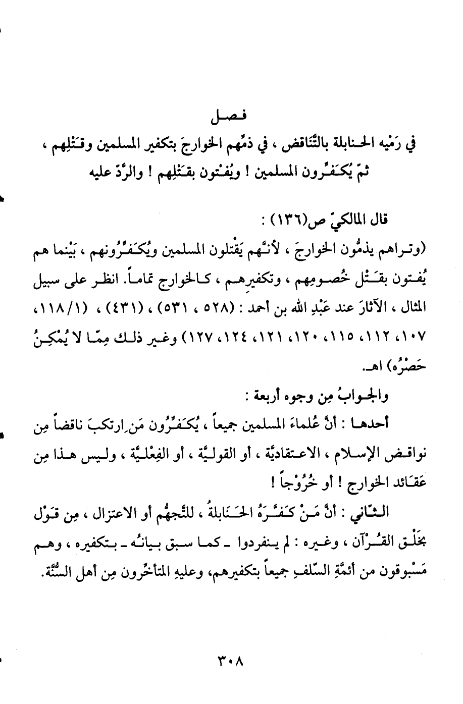 ثم يكفرون المسلمين ويفتون بقتلهم، والرد عليه قال المالكي ص (136) : (وتراهم يذمون الخوارج، لأنهم يقتلون المسلمين ويكفرونهم، بينما هم يفتون بقتل خصومهم وتكفيرهم، كالخوارج تماما. انظر على سبيل المثال، الآثار عند عبد الله بن أحمد: (528، 531) ، (431) ، (1 / 18 1، 107، 112، 115، 120، 121، 124، 127) وغير ذلك مما لا يمكن حصره) اهـ.
