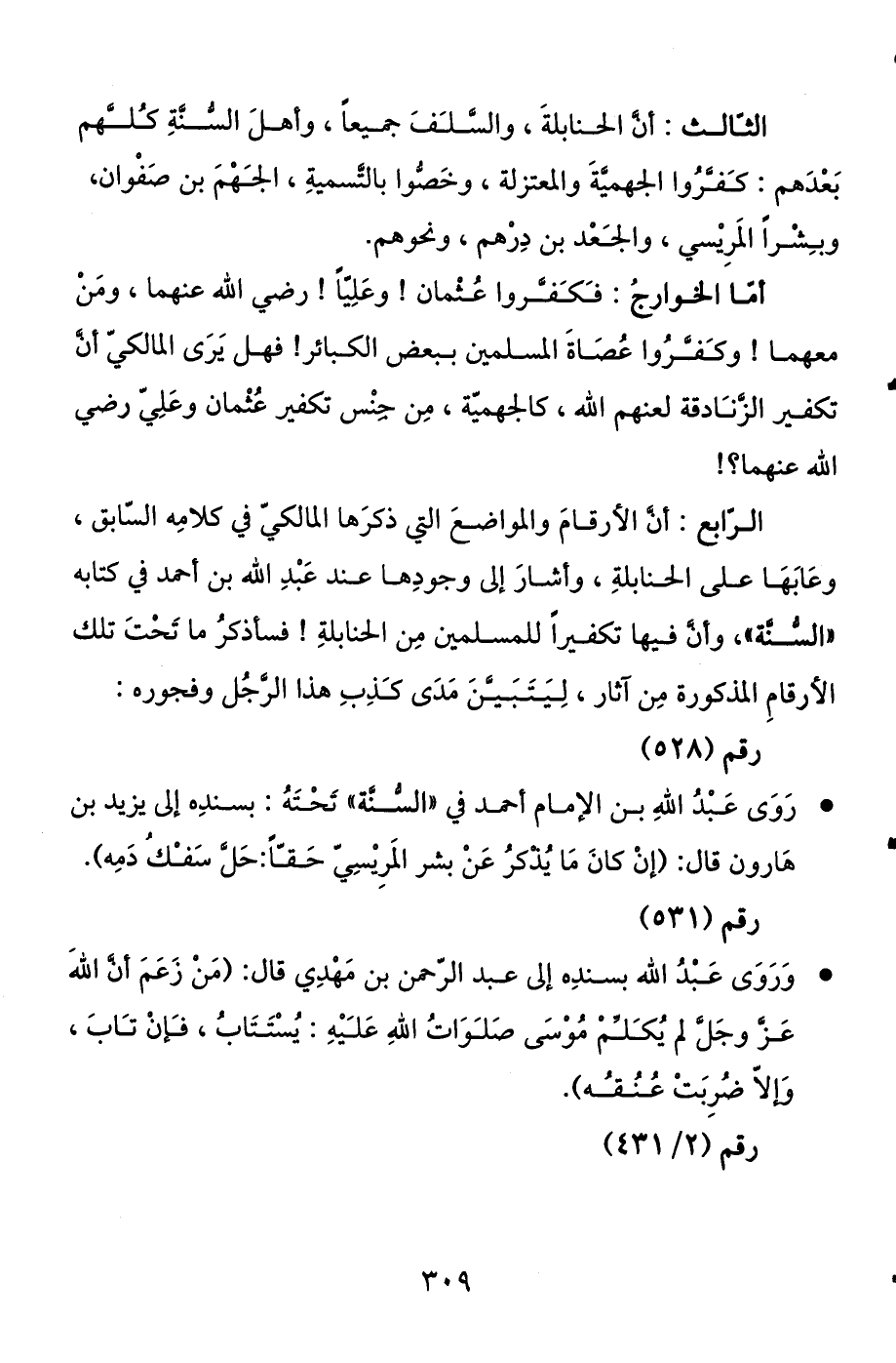 الرابع: أن الأرقام والمواضع التي ذكرها المالكي في كلامه السابق، وعابها على الحنابلة، وأشار إلى وجودها عند عبد الله بن أحمد في كتابه "السنة"، وأن فيها تكفيرا للمسلمين من الحنابلة، فسأذكر ما تحت تلك الأرقام المذكورة من آثار، ليتبين مدى كذب هذا الرجل وفجوره: