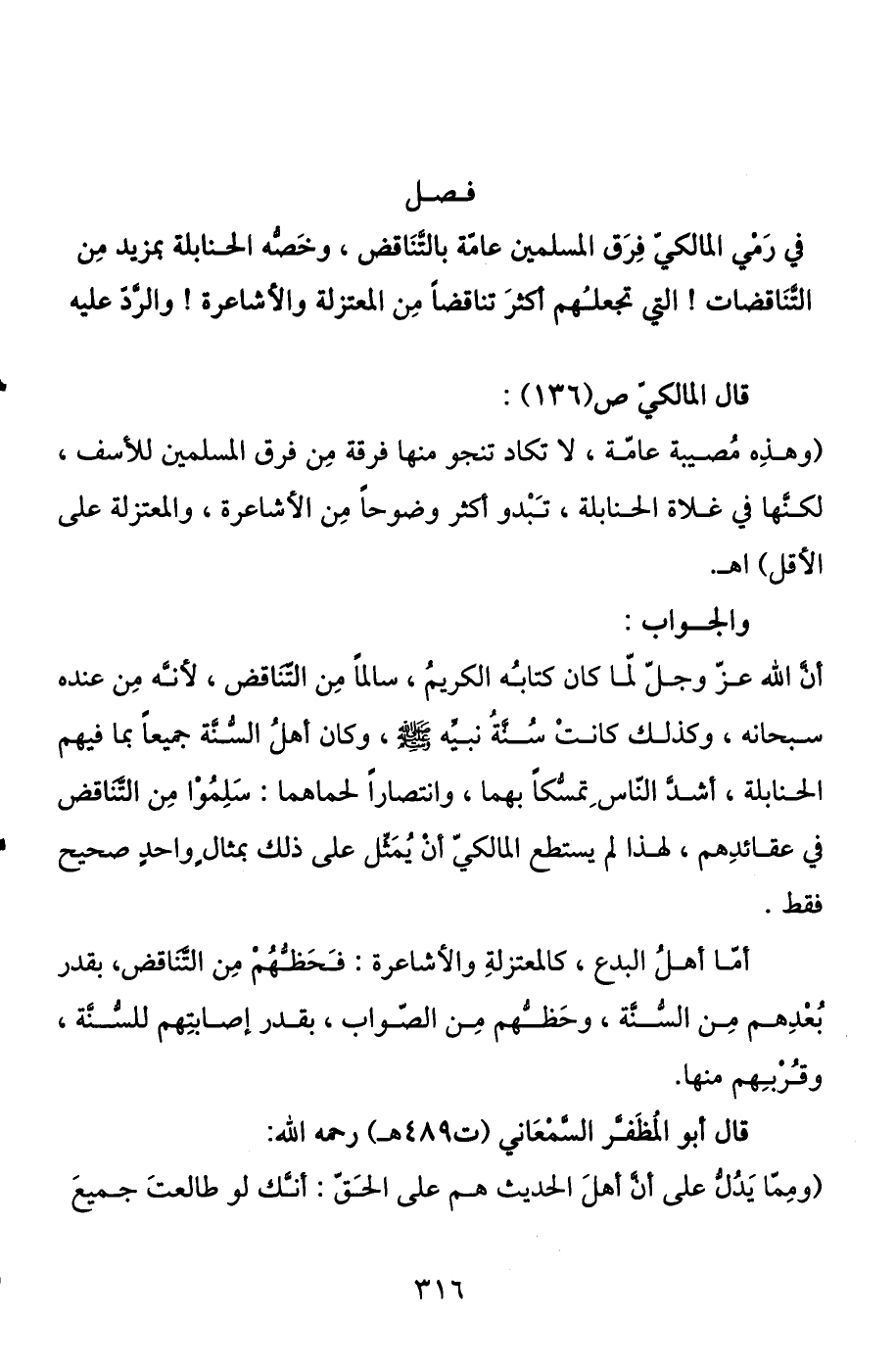 والجواب: أن الله عز وجل لما كان كتابه الكريم، سالما من التناقض، لأنه من عنده سبحانه، وكذلك كانت سنة نبيه صلى الله عليه وسلم، وكان أهل السنة جميعا بما فيهم الحنابلة، أشد الناس تمسكا بهما، وانتصارا لحماهما سلموا من التناقض في عقائدهم، لهذا لم يستطع المالكي أن يمثل على ذلك بمثال واحد صحيح فقط.