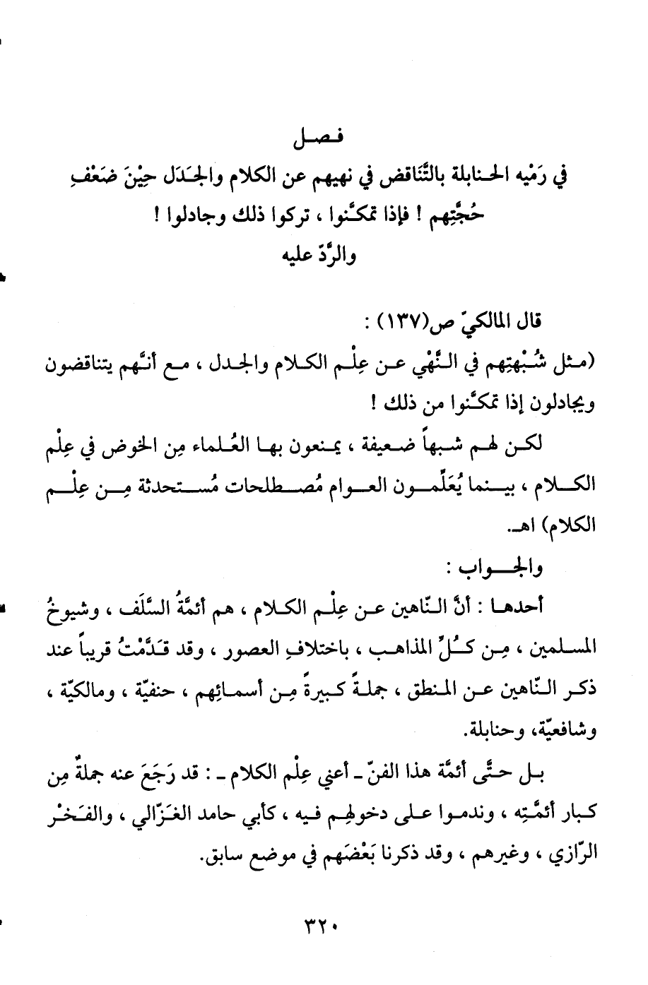 والجواب: أحدها: أن الناهين عن علم الكلام، هم أئمة السلف، وشيوخ المسلمين، من كل المذاهب، باختلاف العصور، وقد قدمت قريبا عند ذكر الناهين عن المنطق، جملة كبيرة من أسمائهم، حنفية، ومالكية، وشافعية، وحنابلة.