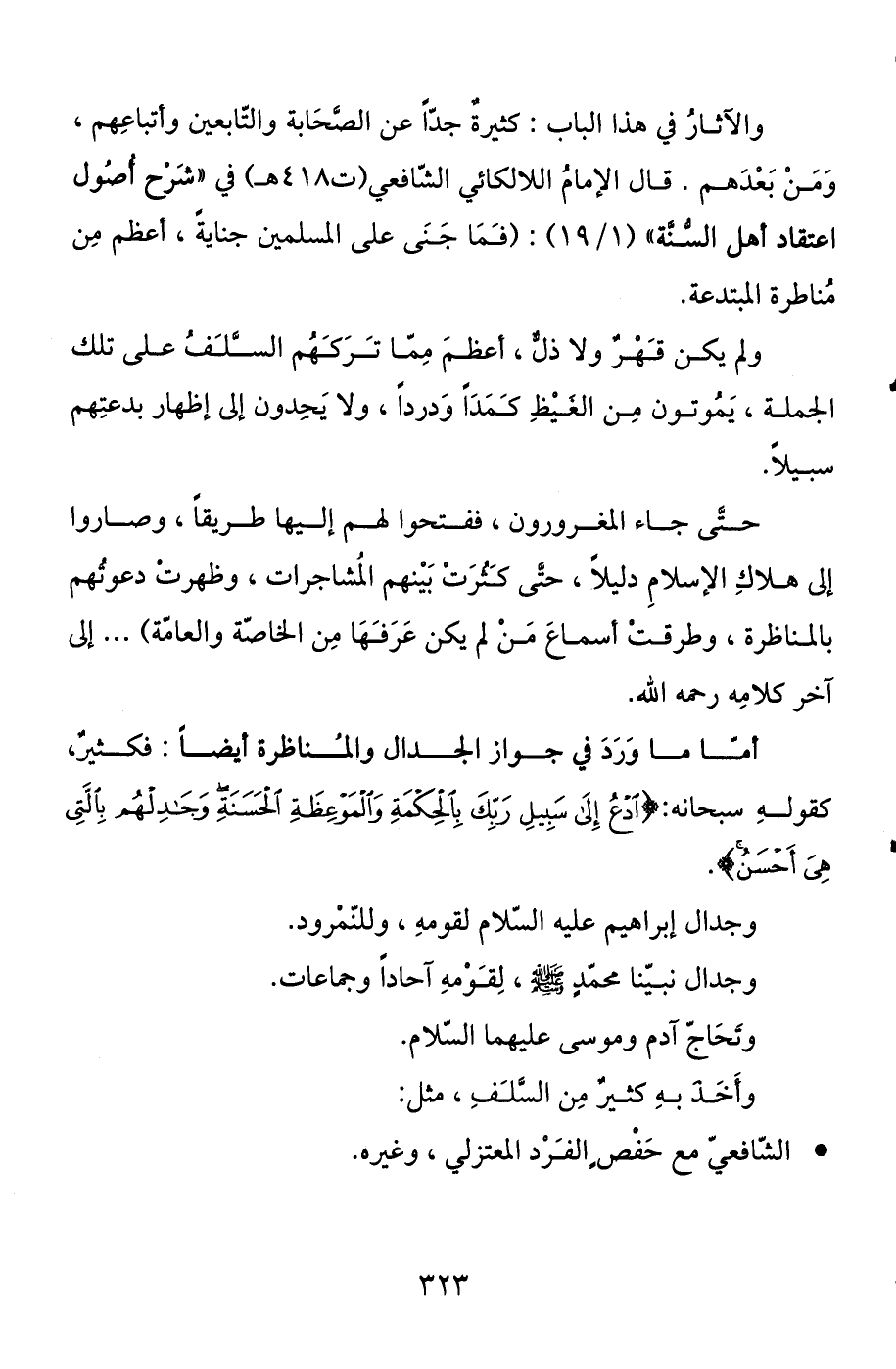 والآثار في هذا الباب كثيرة جدا عن الصحابة والتابعين وأتباعهم، ومن بعدهم، قال الإمام اللالكائي الشافعي (ت 418 هـ) في " شرح أصول اعتقاد أهل السنة " (1 / 19) : (فما جنى على المسلمين جناية أعظم من مناظرة المبتدعة، ولم يكن قهر ولا ذل أعظم مما تركهم السلف على تلك الجملة، يموتون من الغيظ كمدا ودردا، ولا يجدون إلى إظهار بدعتهم سبيلا، حتى جاء المغرورون، ففتحوا لهم إليها طريقا، وصاروا إلى هلاك الإسلام دليلا، حتى كثرت بينهم المشاجرات، وظهرت دعوتهم بالمناظرة، وطرقت أسماع من لم يكن عرفها من الخاصة والعامة) . . . إلى آخر كلامه رحمه الله.